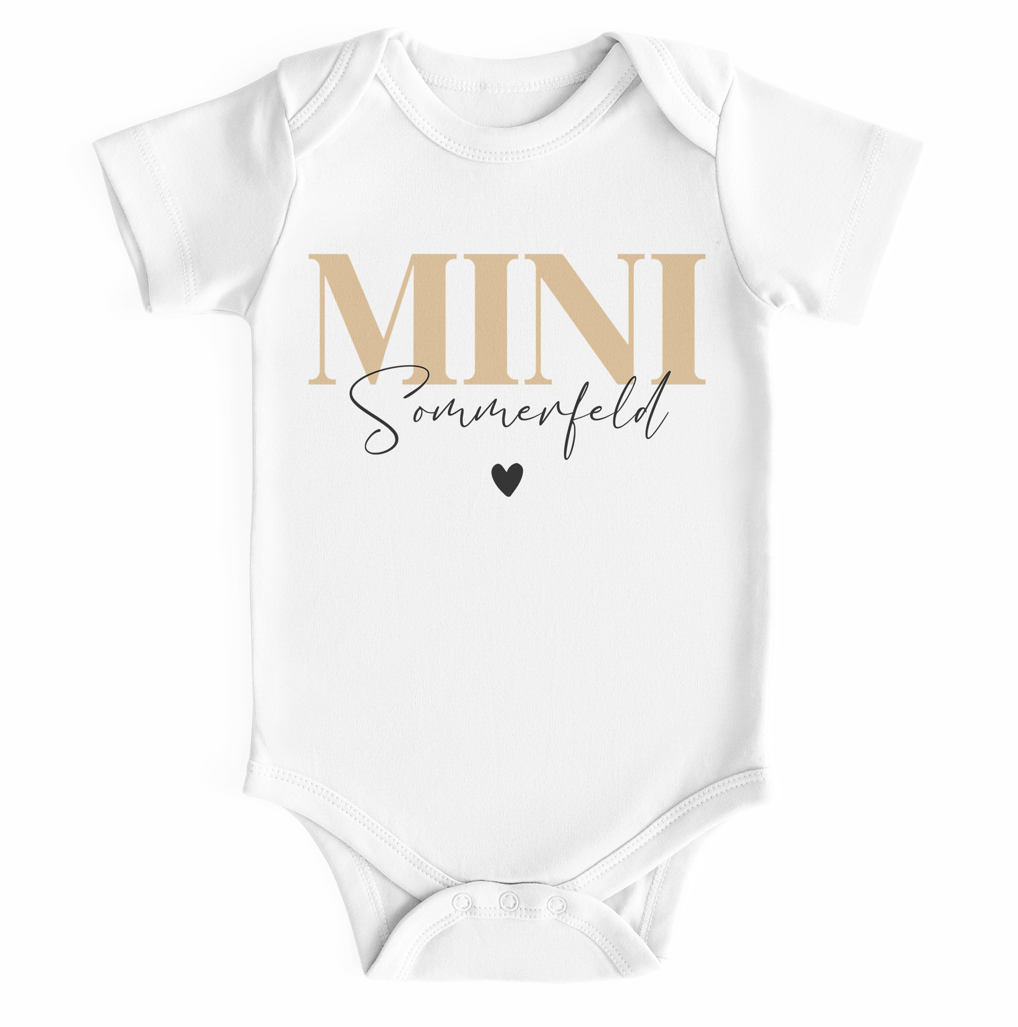 - Niedllicher Babybody mit dem anpassbarem Schriftzug „Mini“ und deinem Familiennamen – ein trendiges Outfit für kleine Lieblingsmenschen und ein herzallerliebstes Geschenk zur Geburt oder Taufe im echten Mini-Me-Style. Einfach "Jetzt anpassen" und Wunschname eingeben