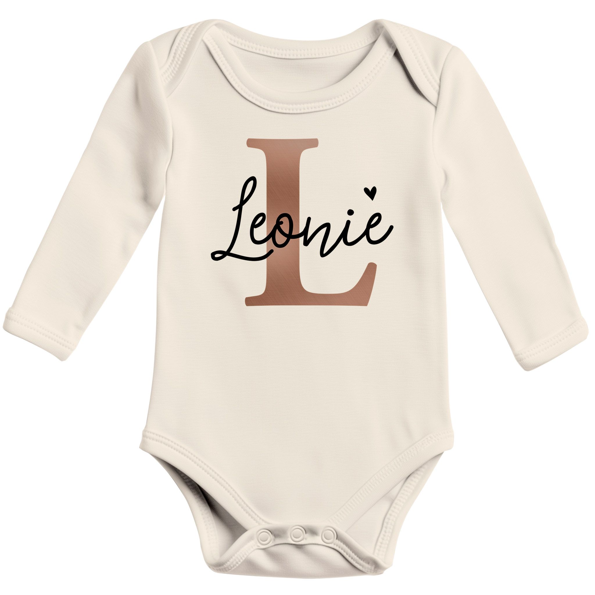 - Niedlicher personalisierbarer Langarmbody mit Name und Anfangsbuchstabe in Kupferoptik, verziert mit einem kleinen Herz. Ein süßes und individuelles Geschenk zur Geburt, zum Geburtstag oder zu Weihnachten