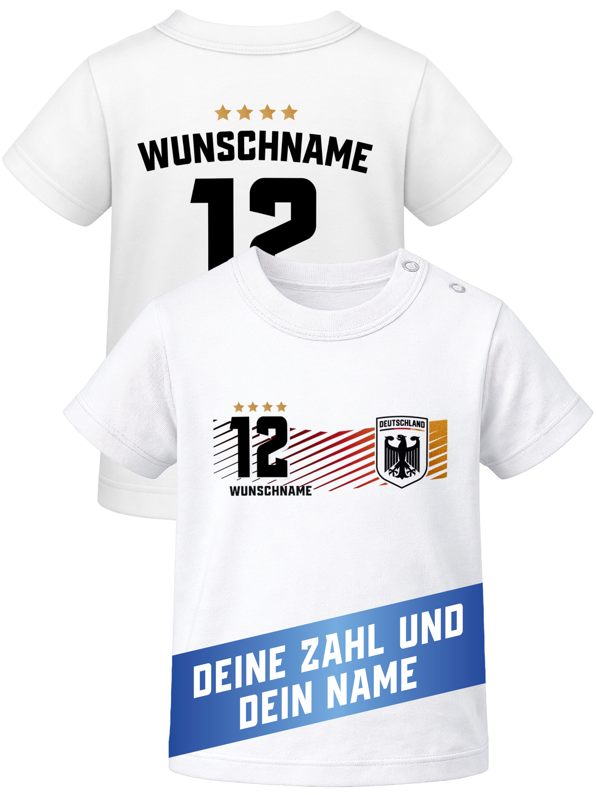 Dieses personalisierte Baby T-Shirt im Fußball Trikot-Stil macht aus dem Nachwuchs den süßesten Fan der WM 2026. Vorne sportliches Fußball-Design, hinten dein Wunschname mit Nummer – genau wie bei den großen Stars auf dem Platz. Das Shirt erinnert an ein echtes Mini-Fußballtrikot und sorgt für Stadionfeeling im Kinderwagen. Ob beim gemeinsamen Fußballabend, beim Public Viewing oder beim Familienfoto: Mit diesem personalisierten Baby Shirt wird sofort klar, für welches Team hier gejubelt wird. Der Druck auf Vorder und Rückseite verleiht dem Shirt einen authentischen Trikot-Look. Name und Nummer machen das Outfit zu einem individuellen Fan-Shirt und einem echten Hingucker für kleine Nachwuchs-Fußballfans.