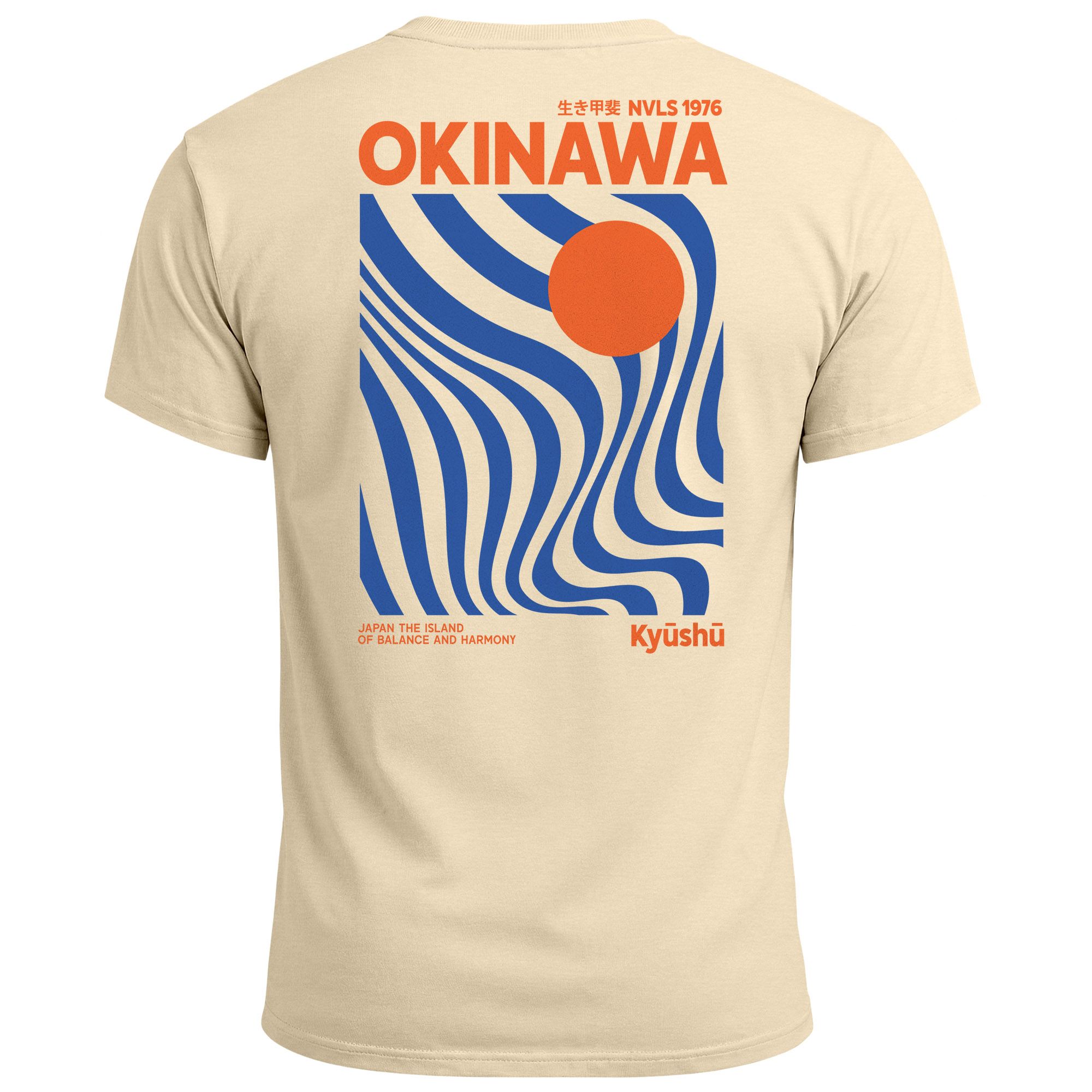 - Japanisches Design trifft Retro-Vibe: Der grafische OKINAWA-Rückendruck mit stilisierter Sonne und abstrakten Wellen verleiht diesem Shirt einen modernen, kunstvollen Look – perfekt für urbane Styles, Reisen und alle, die Fernweh im Herzen tragen