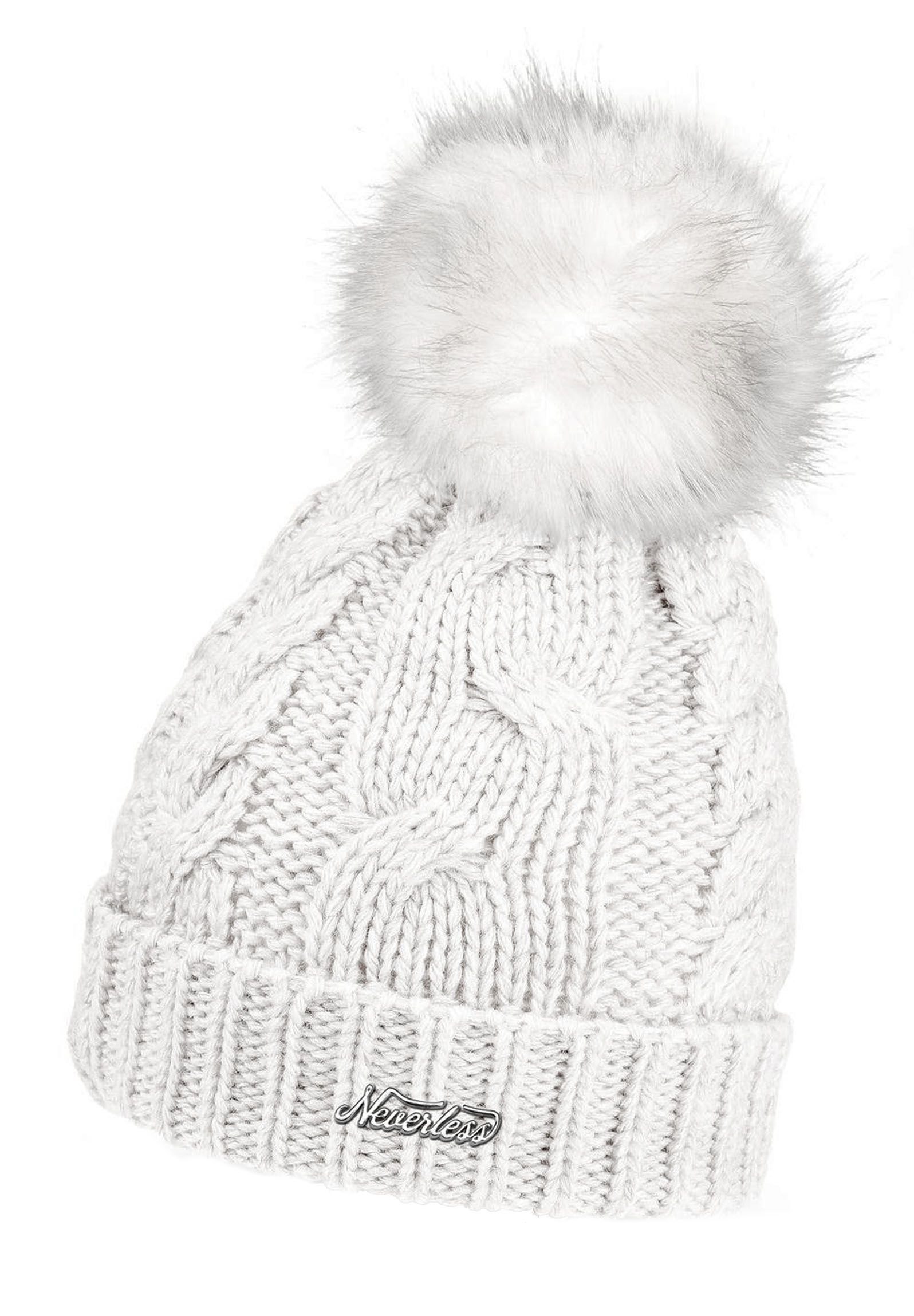Damen Strick-Mütze Merino Wollmütze Bommelmütze Wintermütze mit Umschlag Pudelmütze Strickbeanie Neverless®