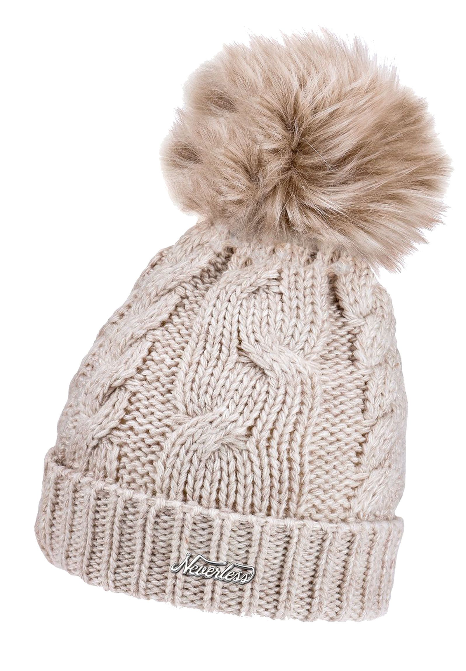 Damen Strickmütze mit Bommel Grobstrick Pudelmütze mit Fellbommel Fake Fur Wintermütze Neverless®