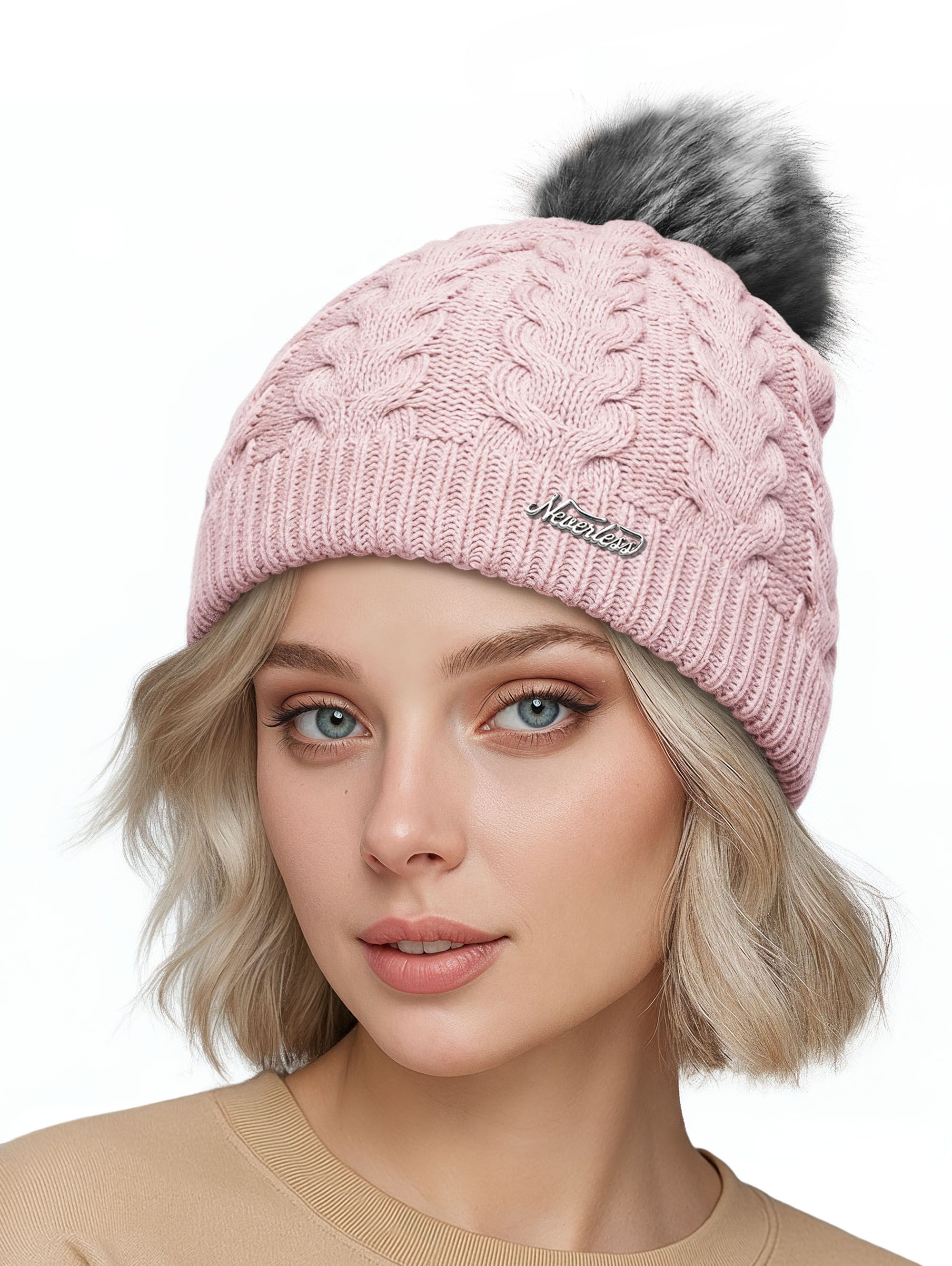 Damen Strickmütze mit Fleecefutter Pudelmütze Wintermütze Warm & Gefüttert mit Bommel Model 1975 Neverless®