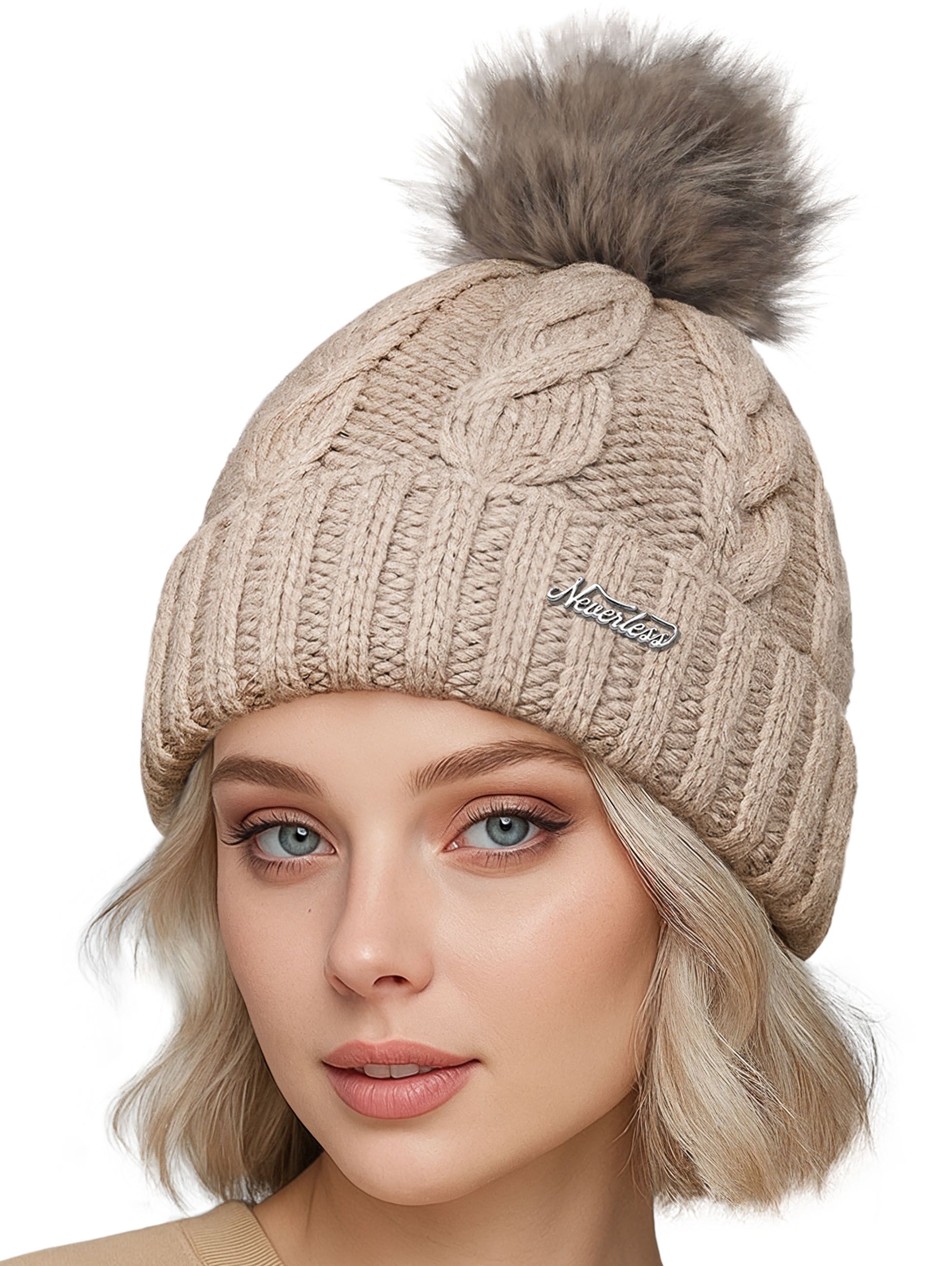 Damen Strickmütze mit Fleecefutter und Kunstfell Bommel Zopfmuster Grobstrick Wintermütze Bommelmütze Model 2207 Neverless®