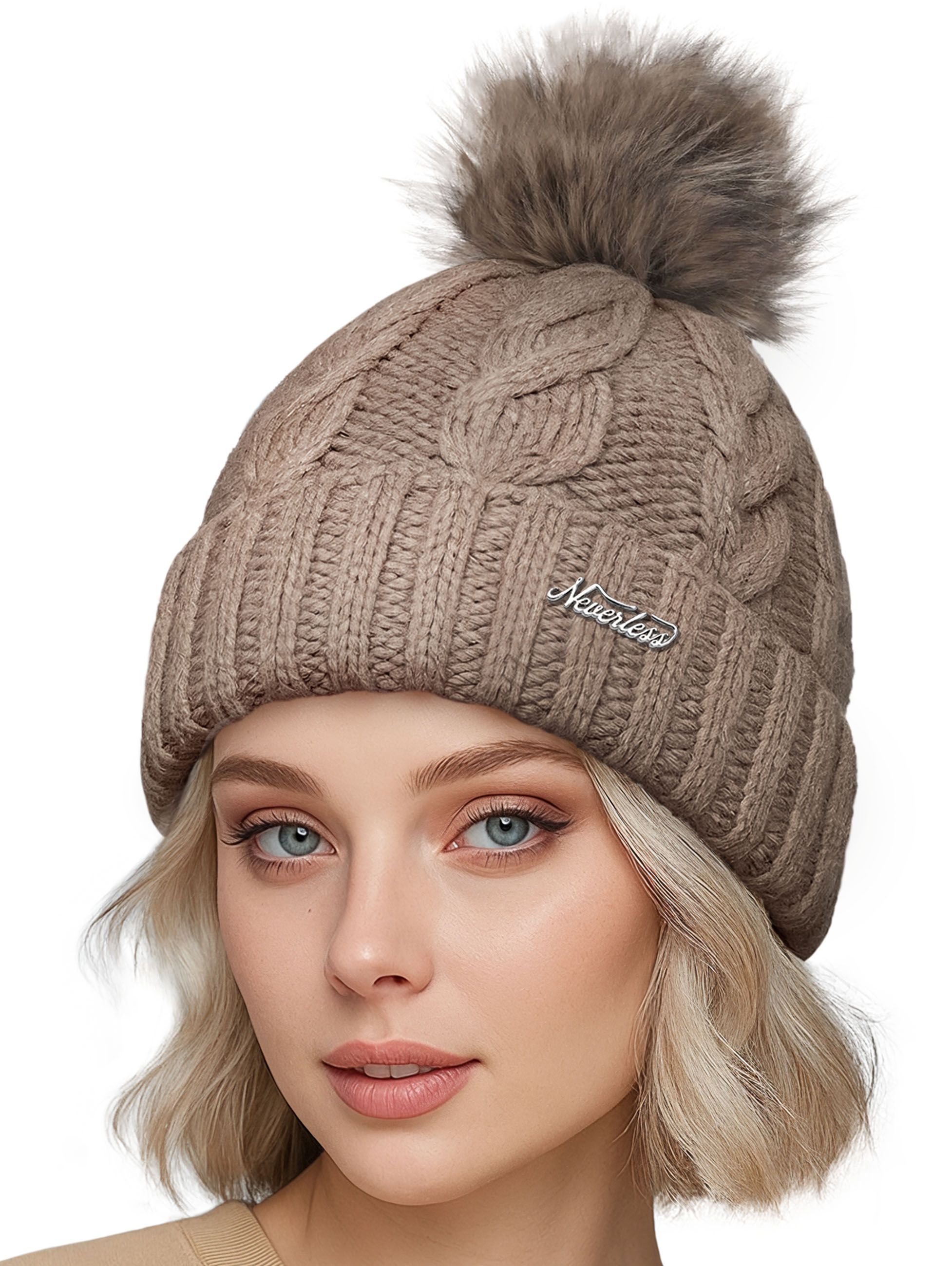 Damen Strickmütze mit Fleecefutter und Kunstfell Bommel Zopfmuster Grobstrick Wintermütze Bommelmütze Model 2207 Neverless®