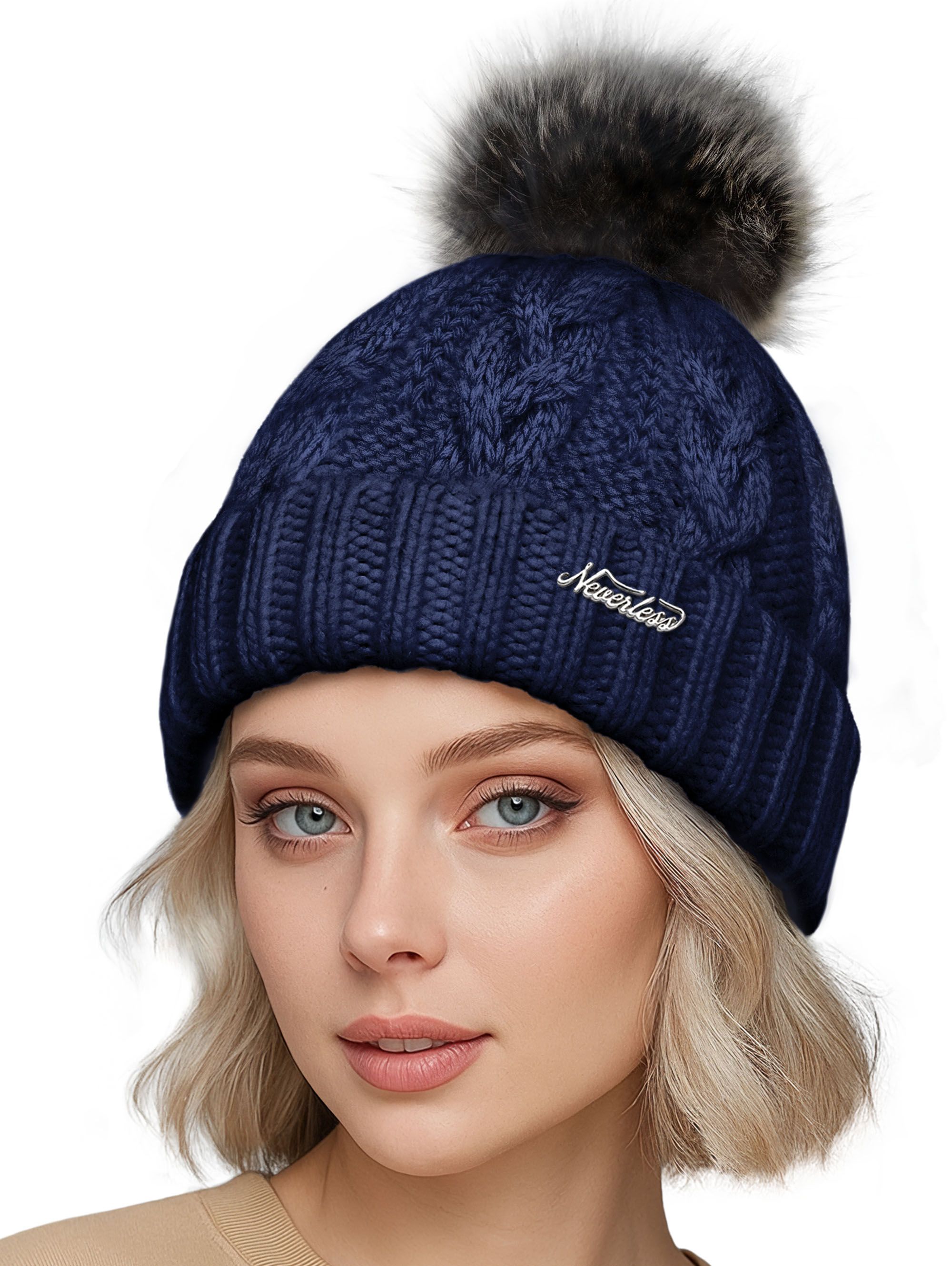 Damen Strickmütze mit Pompom Zopfstrickmuster Bommelmütze gefüttert mit Fleece Wintermütze Model 1979 Neverless®