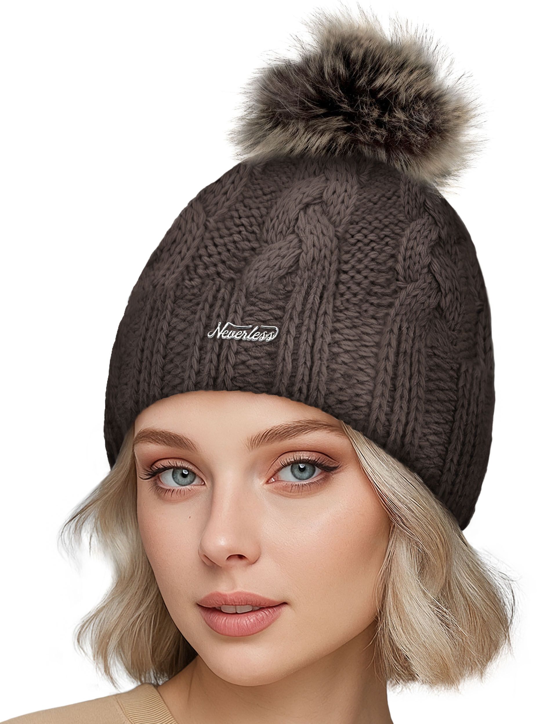 Damen Strickmütze Zopfmuster Fleccefutter Bommelmütze Pudelmütze Wintermütze Accessoires Herbst Winter Model 2213 Neverless®
