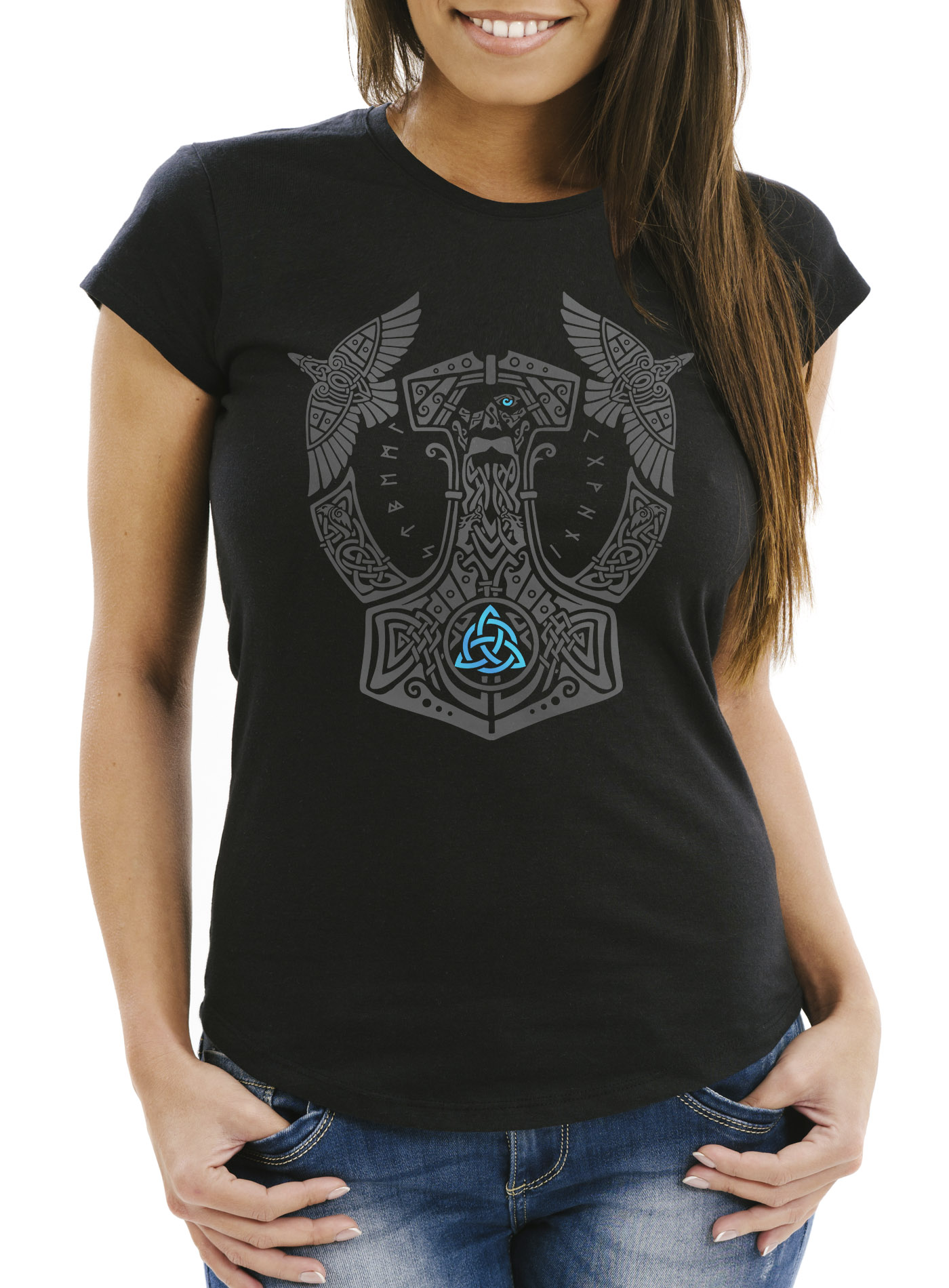 - Cooles Printshirt für moderne Wikingerfrauen und lässige Schildmaiden. Mit einem einzigartigem stilisiertem Design aus den beiden Raben des Göttervater Odin, dem nordischen Hammer mit Valknut und mystischen Runen