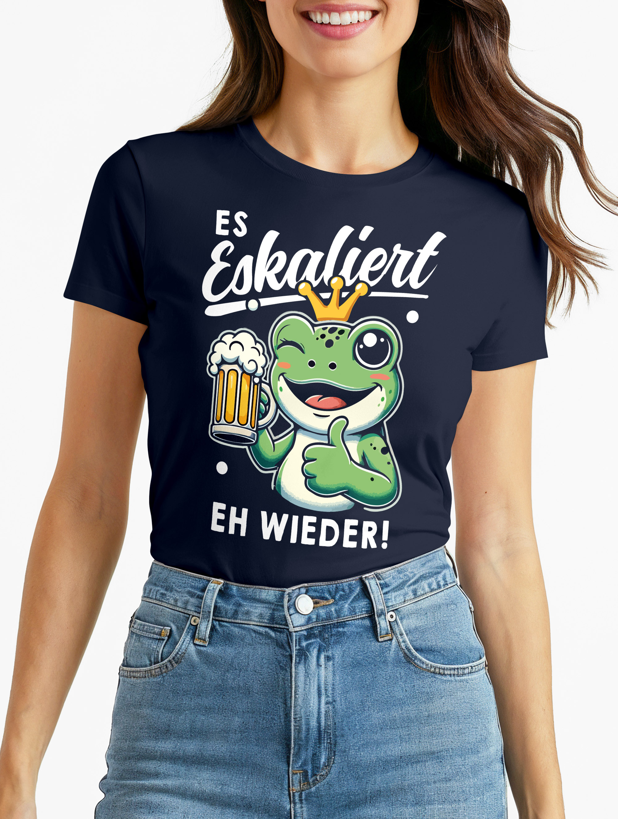 • Partyshirt mit Humor: Egal ob Einhorn, Frosch oder Clown – das witzige Motiv mit dem Spruch „Es eskaliert eh wieder!“ sorgt bei jedem Anlass für gute Laune und viele Lacher