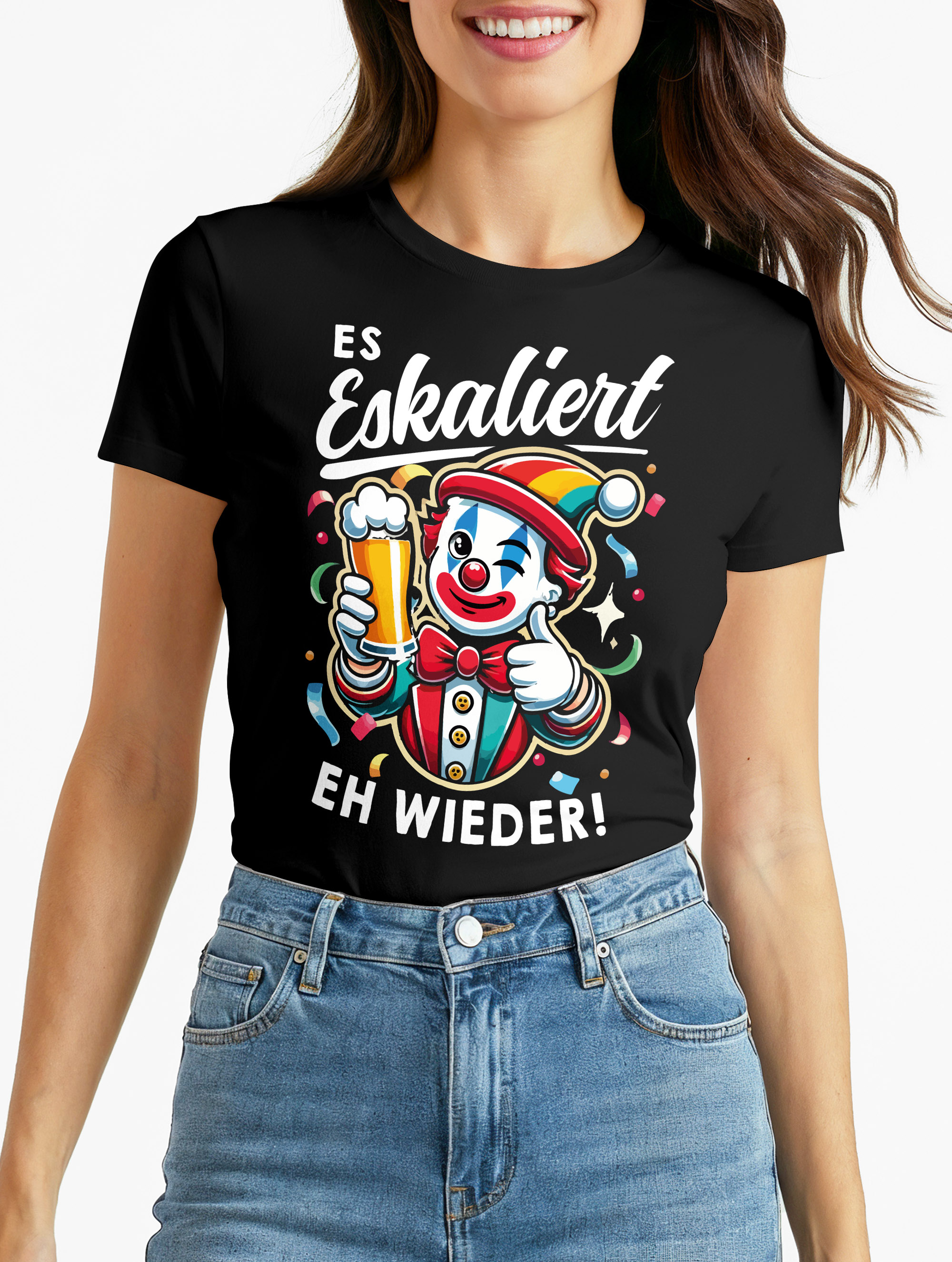 Damen T-Shirt Spruch Es eskaliert eh Frosch Einhorn Clown Fasching Karneval Frauen Fun-Shirt lustig Slim Fit Moonworks®