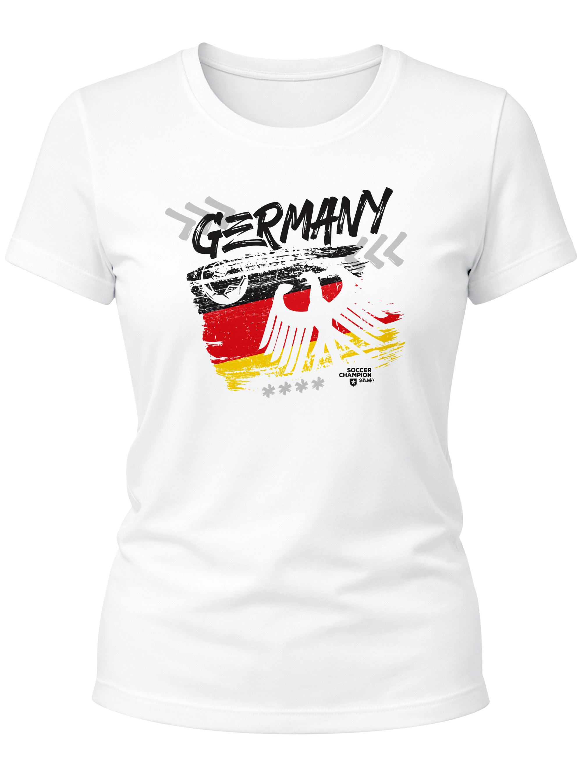 • ausgefallenes Motiv coolem Germany-Schirftzug und Deutschland-Flagge mit Adler und Fußball im markanten "Brush-Stil" - der perfekte Deutschland-Trikot für Frauen