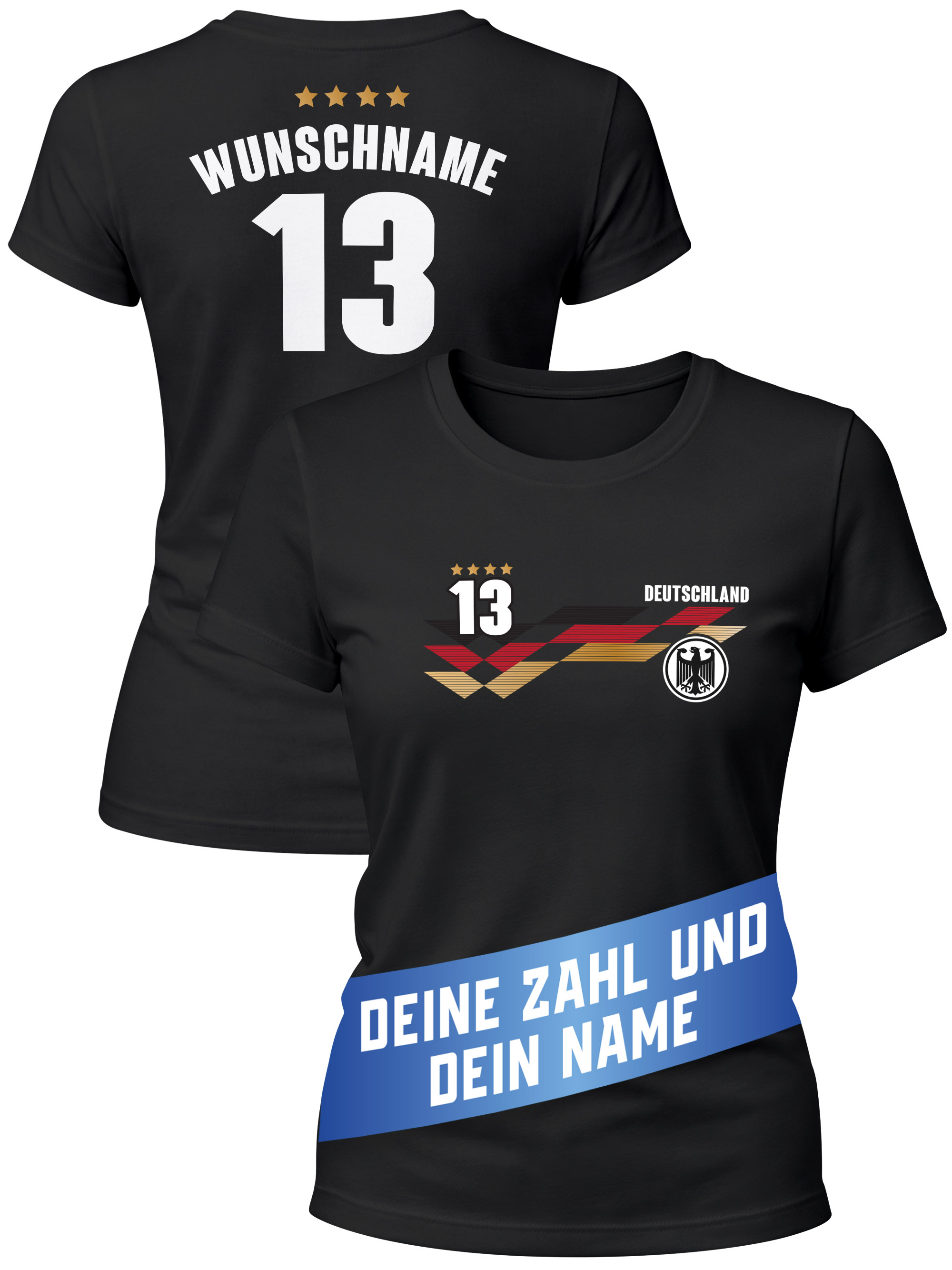 - Cooles T-Shirt für Frauen zur Fußball Weltmeisterschaft 2026. Die moderne und günstige Alternative zu klassischen Deutschland-Trikots. Personalisierbar mit dem eigenen Namen und individueller Trikot-Nummer