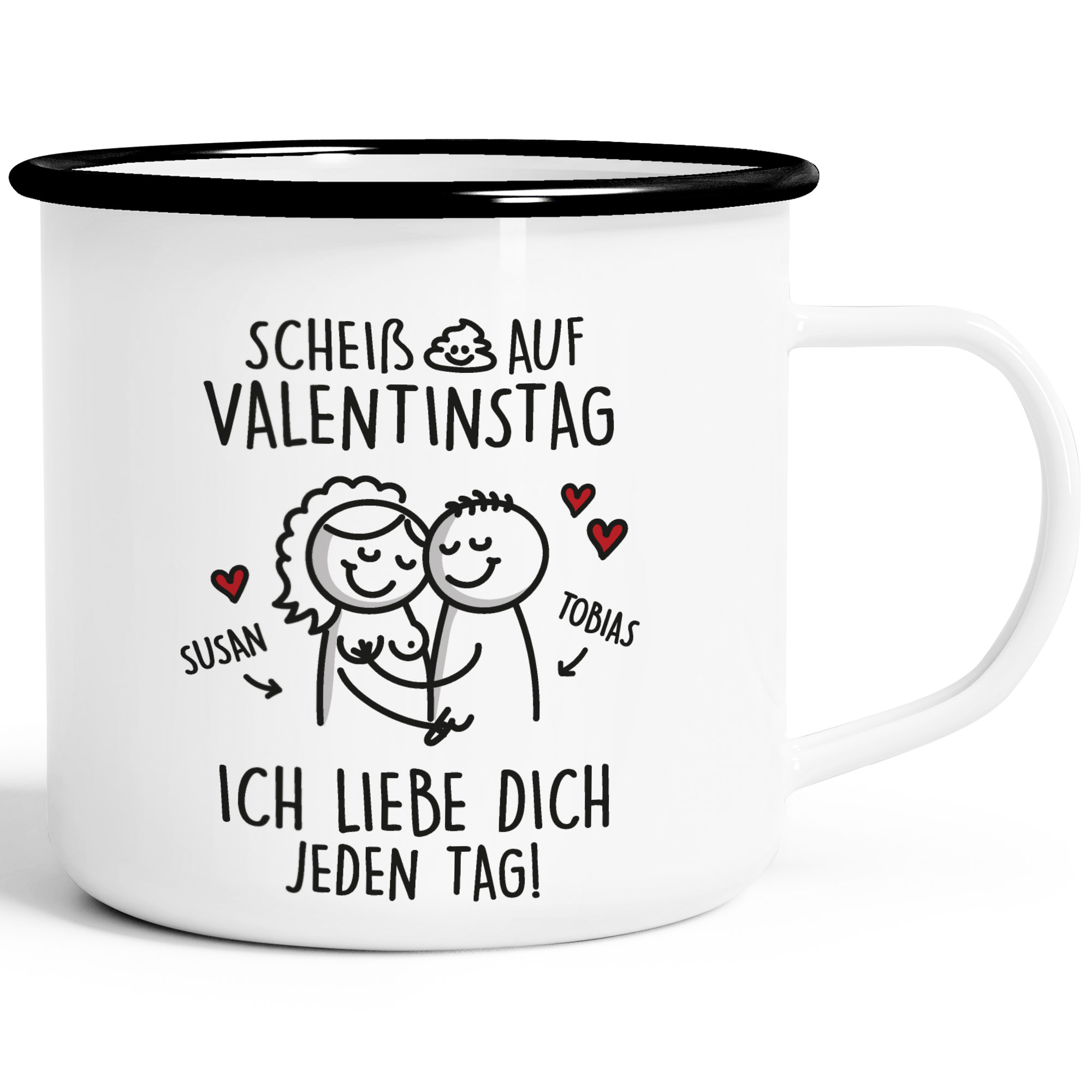 - Du suchst ein lustiges Geschenk zum Valentinstag? Eine kleine, aber witzige Geschenkidee ist dieser Emaillebecher bedruckt mit lustigen... sich befummelnden ;-) ...Strichmännchen und mit personalisierbarem Spruch "Scheiß auf Valentinstag ich liebe dich jeden Tag" + Wunschnamen