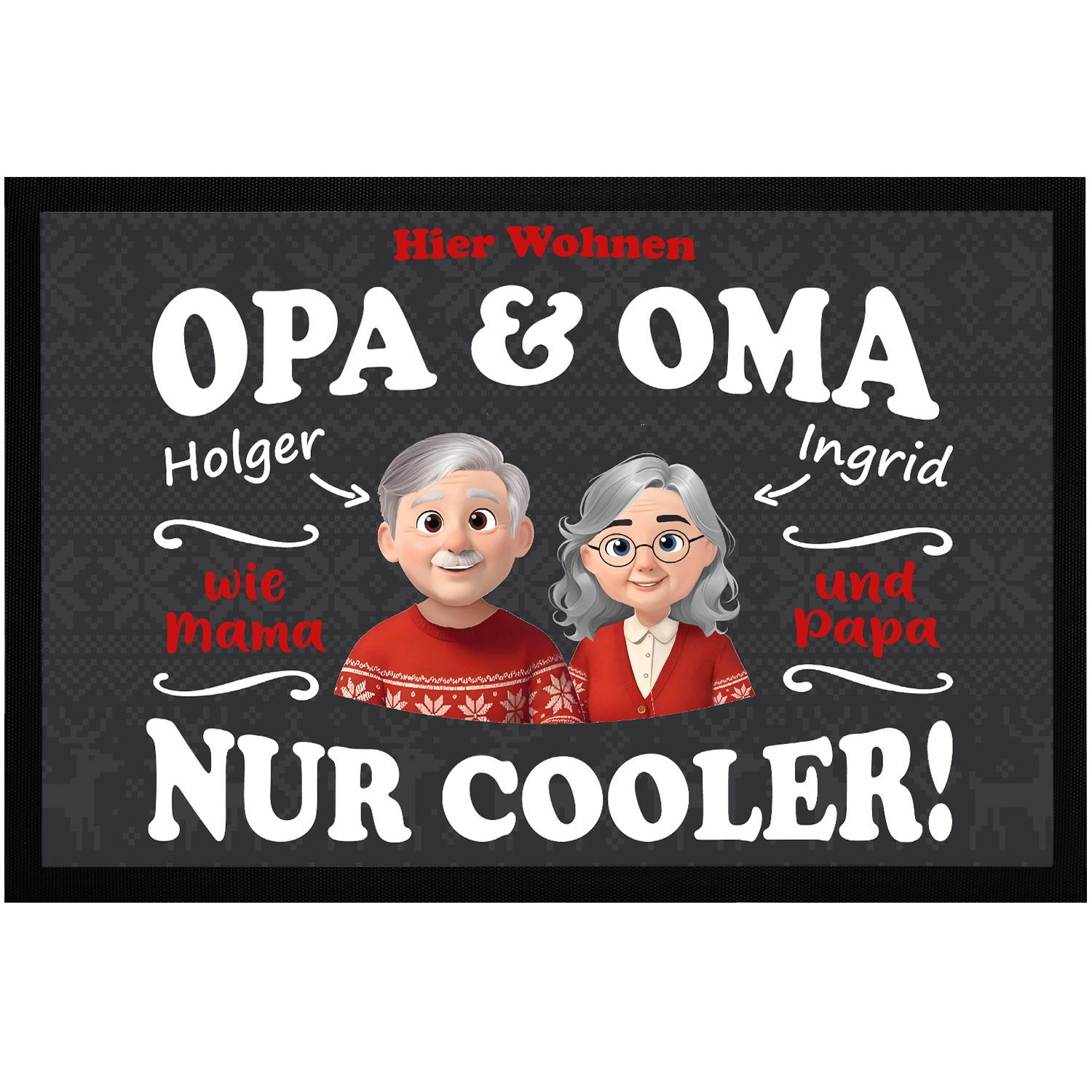 - Personalisierte Fußmatte für Oma und Opa: Liebevoll gestaltete Fußmatte mit anpassbaren Figuren und Namen – perfekt als individuelle Fußmatte für Großeltern mit lustigem Familienspruch "Hier wohnen Oma und Opa -wie Mama und Papa, nur cooler!