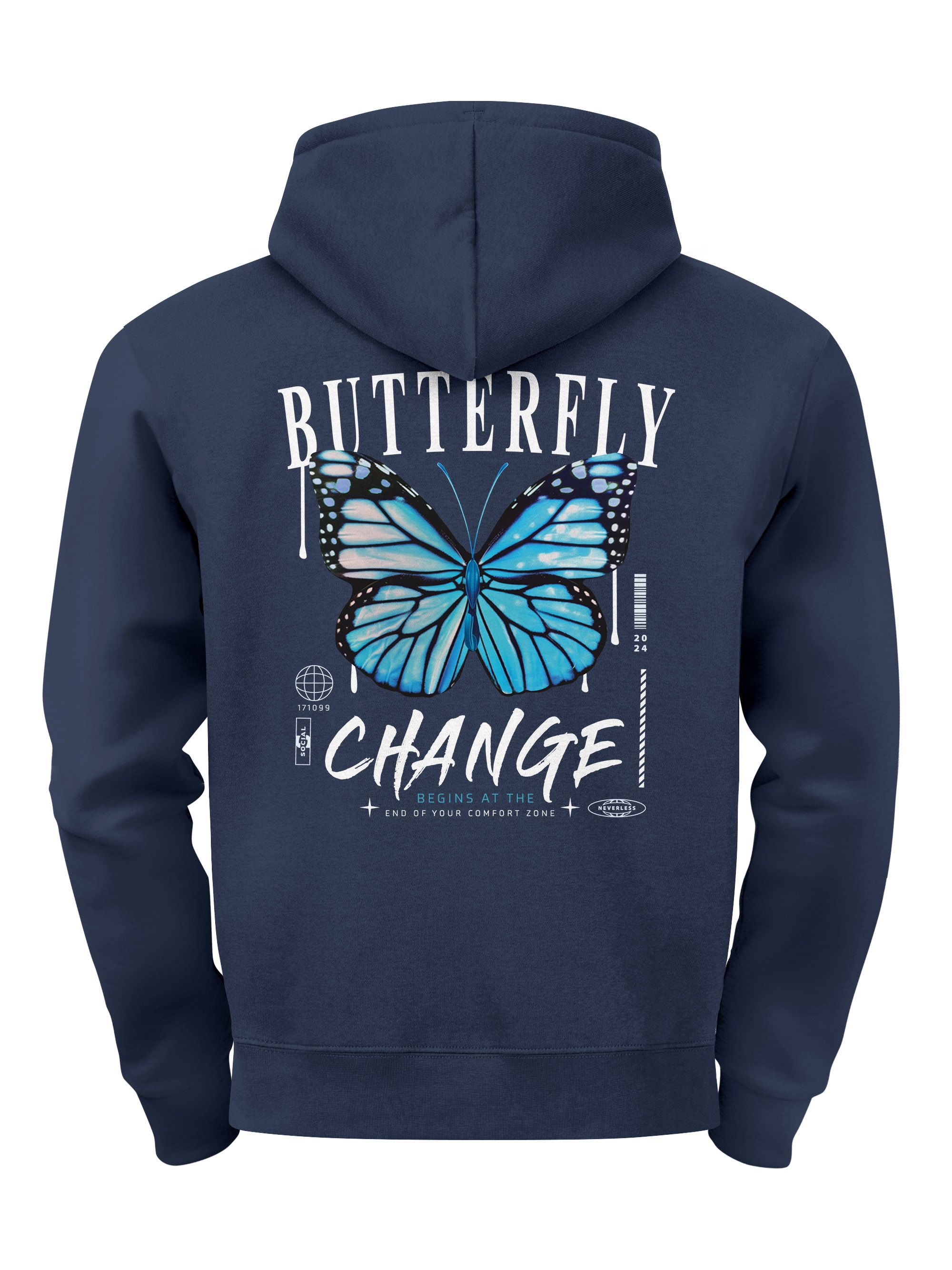 Herren Hoodie Backprint Butterfly Change | Kapuzensweatshirt mit blauem Schmetterling Motivdruck Streetstyle Neverless®