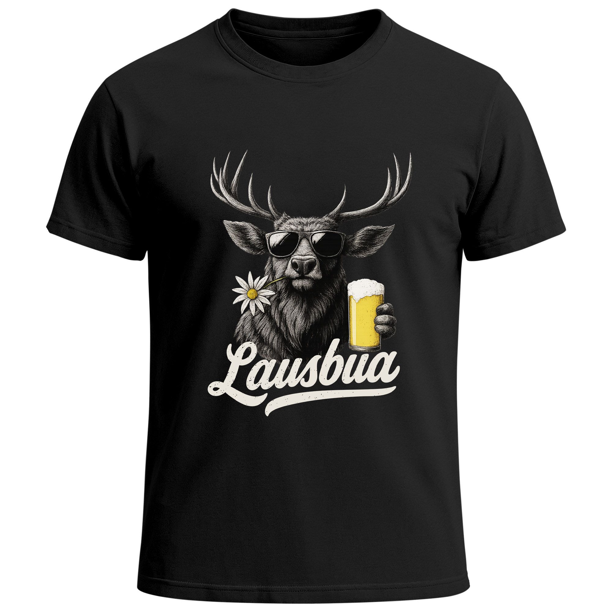 - Motiv: "Lausbua" Schriftzug und Hirsch mit Sonnenbrille, Edelweiß und Bier Motiv