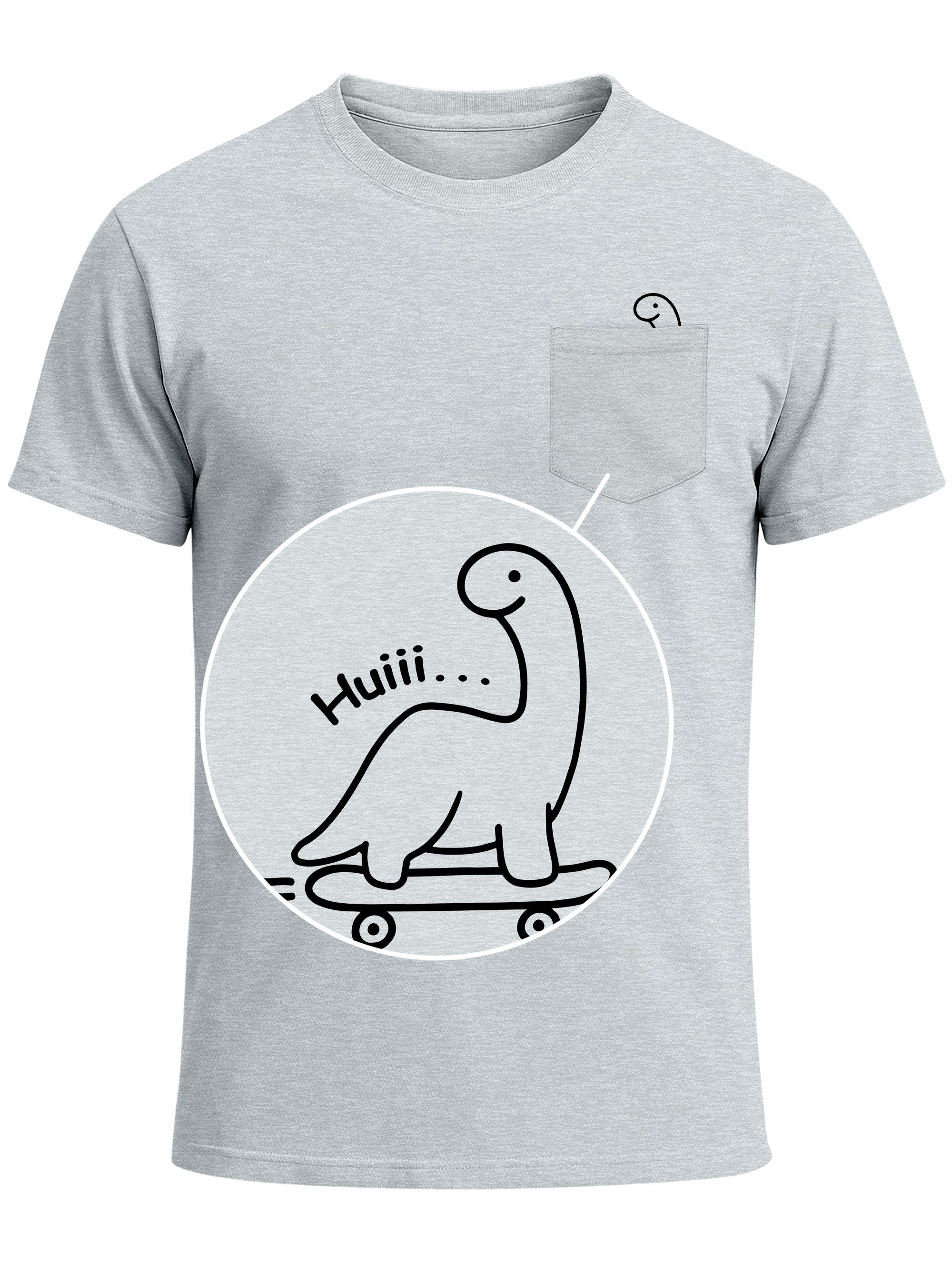 - Lustiges T-Shirt mit Brusttasche: Achtung, Taschenmonster! Aber ein sehr Niedliches! Dieser Skater-Dino schaut neugierig aus der Tasche und sorgt garantiert für Gesprächsstoff. Ein cooles Design mit Aha-Effekt – und tierisch witzigem Taschen-Insider