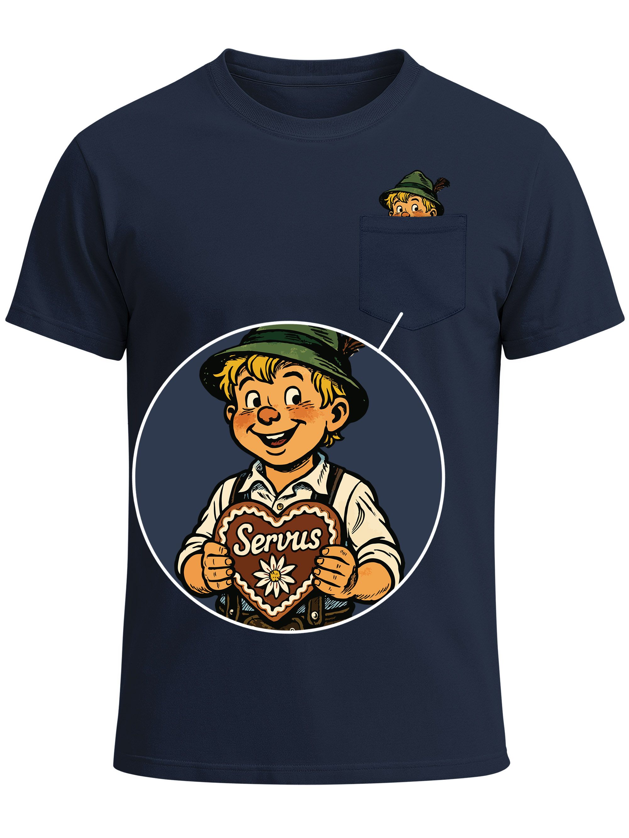 - Lustiges T-Shirt mit Brusttasche: Witziges "Wiesn-inspiriertes" Motiv, bei dem ein Lausbua mit Lebkuchenherz scheinbar aus der Tasche hervorschaut. Mit "Servus", "Mei Lederhosn is in da Wäsch", "N scheiss muss i" oder "Mogst mit mi gehn?" Aufdruck - Ideal für Volksfest, Biergarten oder als originelles Geschenk für Männer mit Humor und Liebe zur bayrischen Tradition