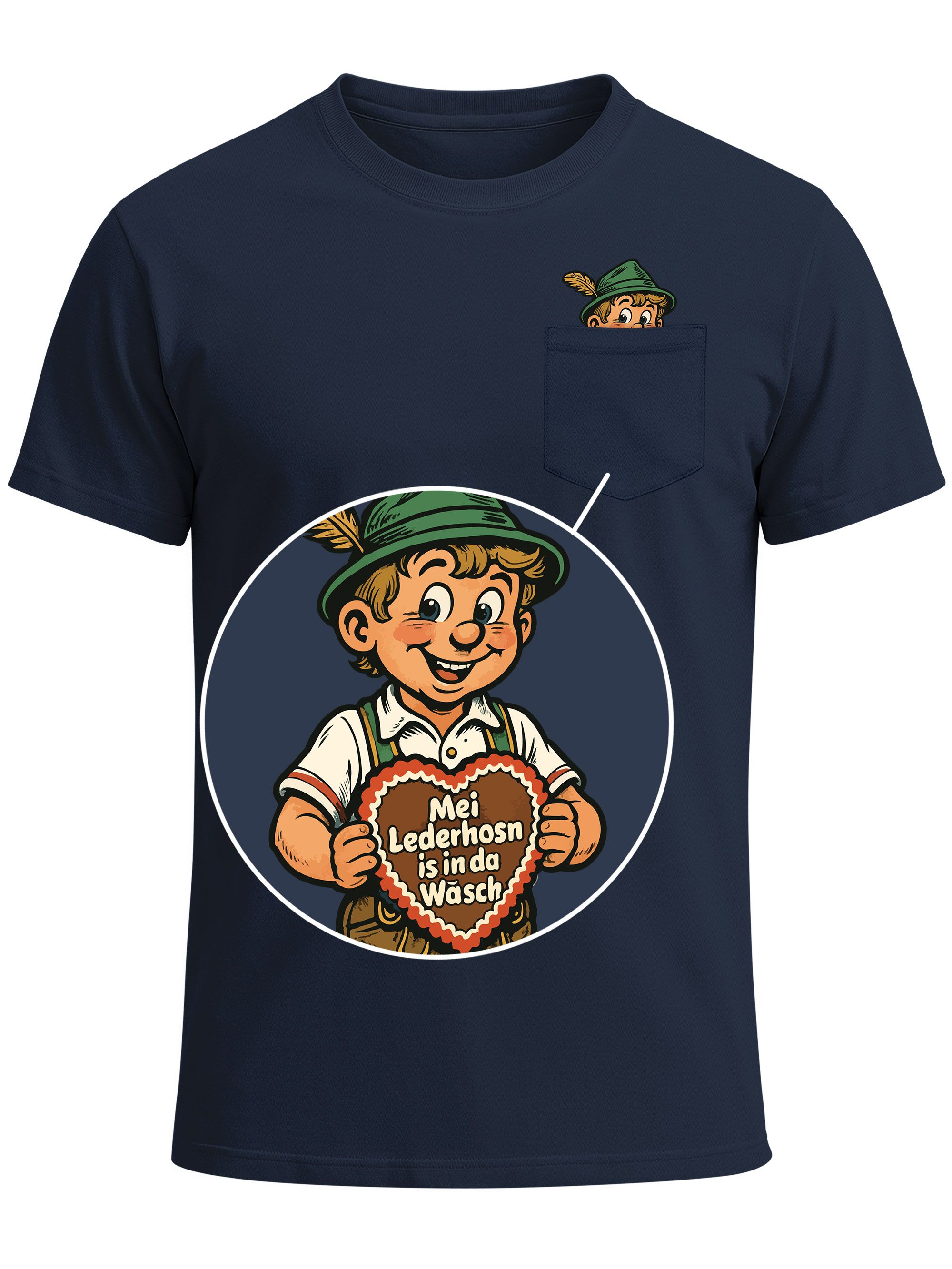 - Lustiges T-Shirt mit Brusttasche: Witziges "Wiesn-inspiriertes" Motiv, bei dem ein Lausbua mit Lebkuchenherz scheinbar aus der Tasche hervorschaut. Mit "Servus", "Mei Lederhosn is in da Wäsch", "N scheiss muss i" oder "Mogst mit mi gehn?" Aufdruck - Ideal für Volksfest, Biergarten oder als originelles Geschenk für Männer mit Humor und Liebe zur bayrischen Tradition