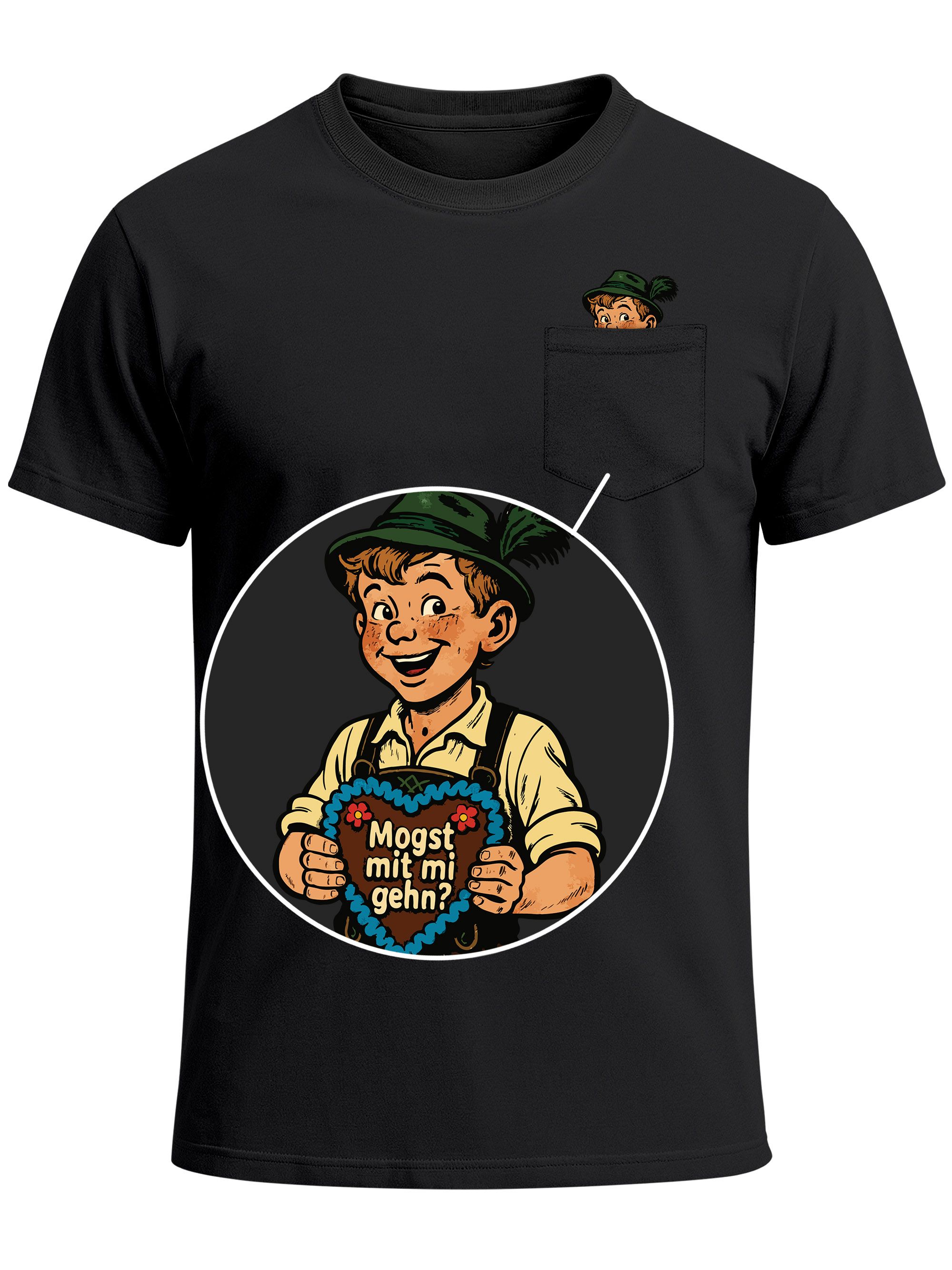 - Lustiges T-Shirt mit Brusttasche: Witziges "Wiesn-inspiriertes" Motiv, bei dem ein Lausbua mit Lebkuchenherz scheinbar aus der Tasche hervorschaut. Mit "Servus", "Mei Lederhosn is in da Wäsch", "N scheiss muss i" oder "Mogst mit mi gehn?" Aufdruck - Ideal für Volksfest, Biergarten oder als originelles Geschenk für Männer mit Humor und Liebe zur bayrischen Tradition