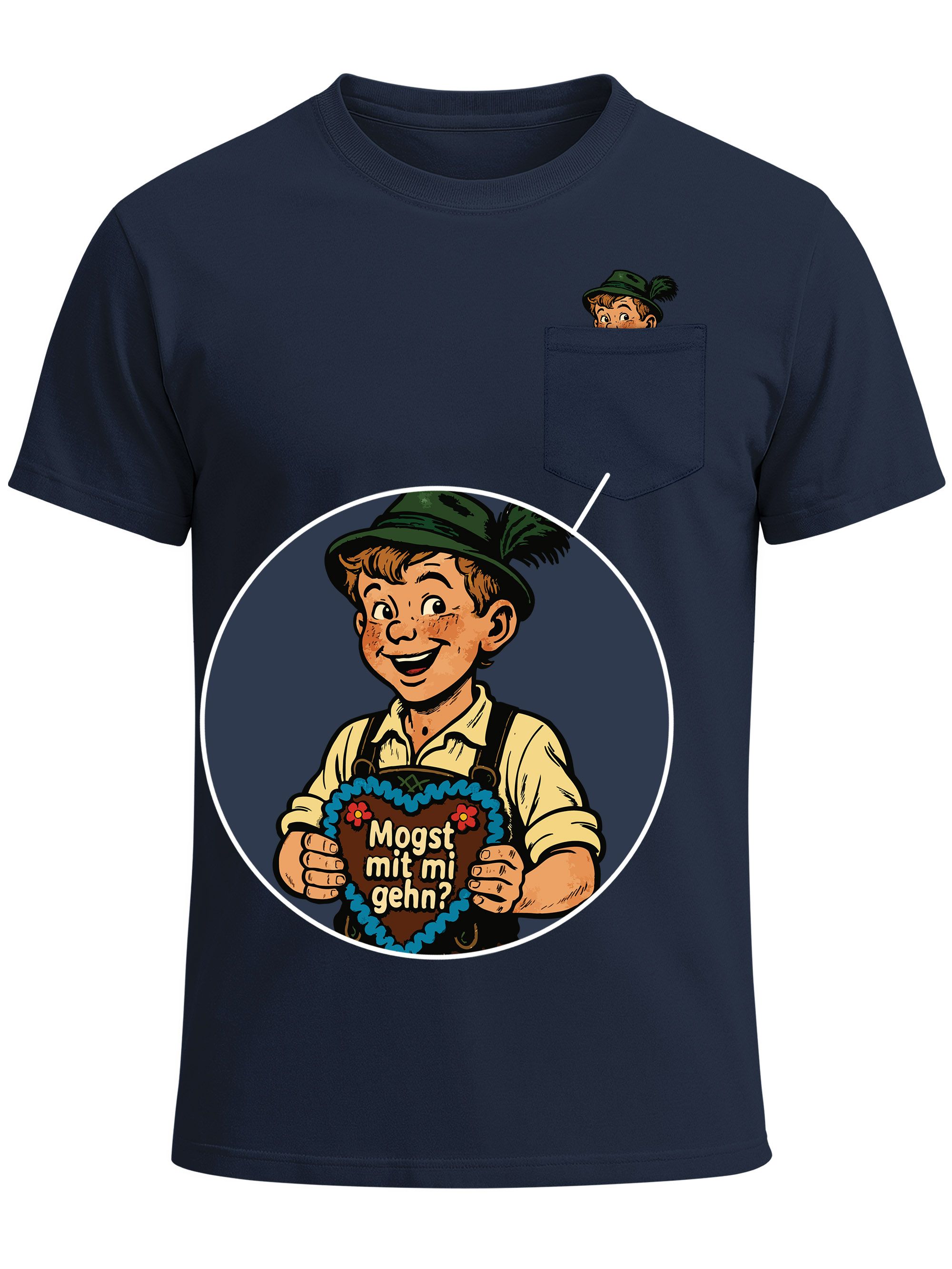 - Lustiges T-Shirt mit Brusttasche: Witziges "Wiesn-inspiriertes" Motiv, bei dem ein Lausbua mit Lebkuchenherz scheinbar aus der Tasche hervorschaut. Mit "Servus", "Mei Lederhosn is in da Wäsch", "N scheiss muss i" oder "Mogst mit mi gehn?" Aufdruck - Ideal für Volksfest, Biergarten oder als originelles Geschenk für Männer mit Humor und Liebe zur bayrischen Tradition