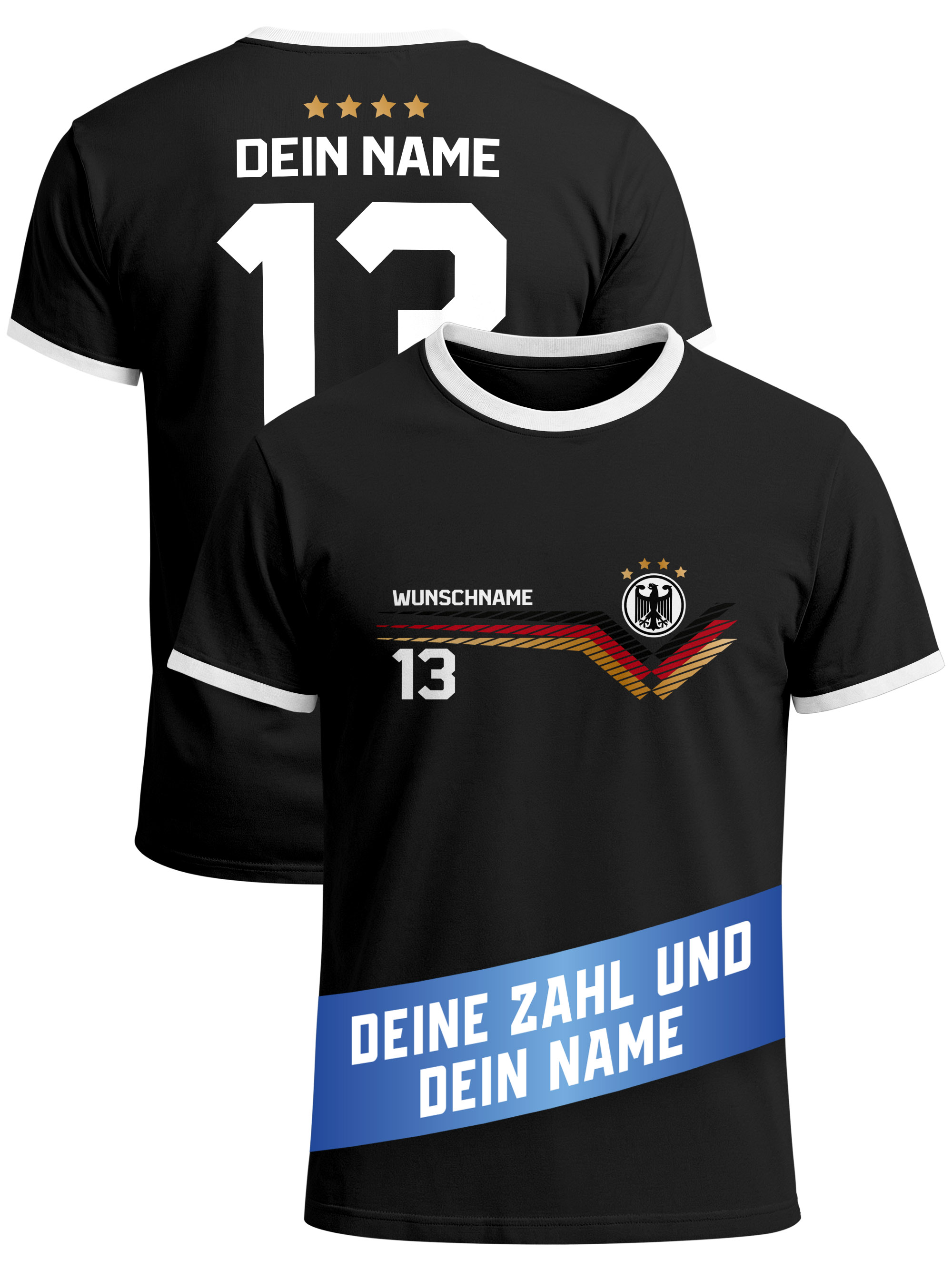 - Klassisches Deutschland-T-Shirt mit anpassbarem Design auf Vorder- und Rückseite. Trage unter "Jetzt anpassen" den gewünschten Namen und deine Wunschzahl ein, und wir fertigen dein individuelles Deutschland-Trikot für die WM 2026.