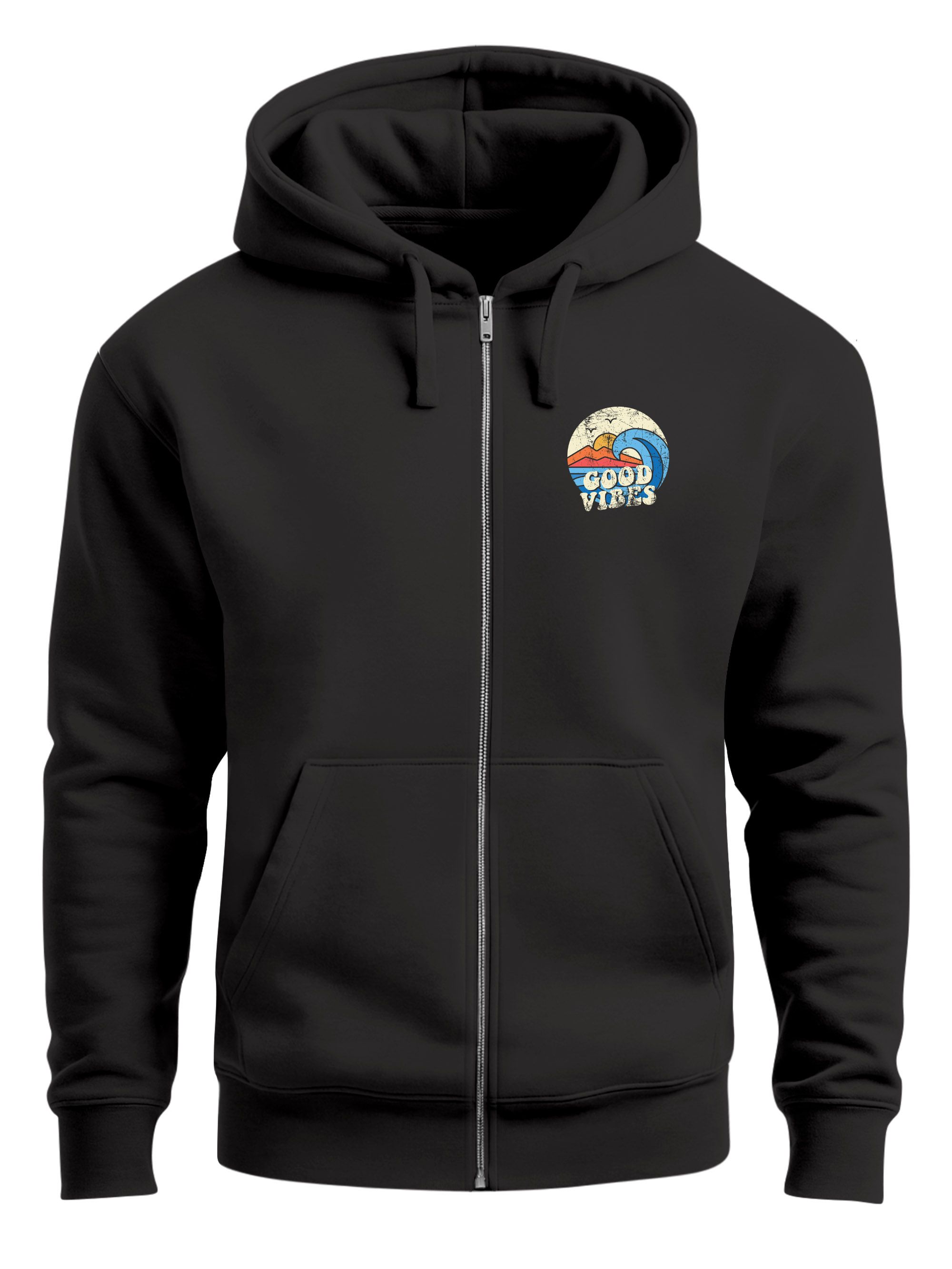 - Kapuzen-Sweatjacke für Männer mit kleinem Logoprint auf der linken Brust. Durch den dezenten "Good Vibes" Schriftzug mit Welle Grafik erhält die Basic-Zipjacke einen individuellen Touch.