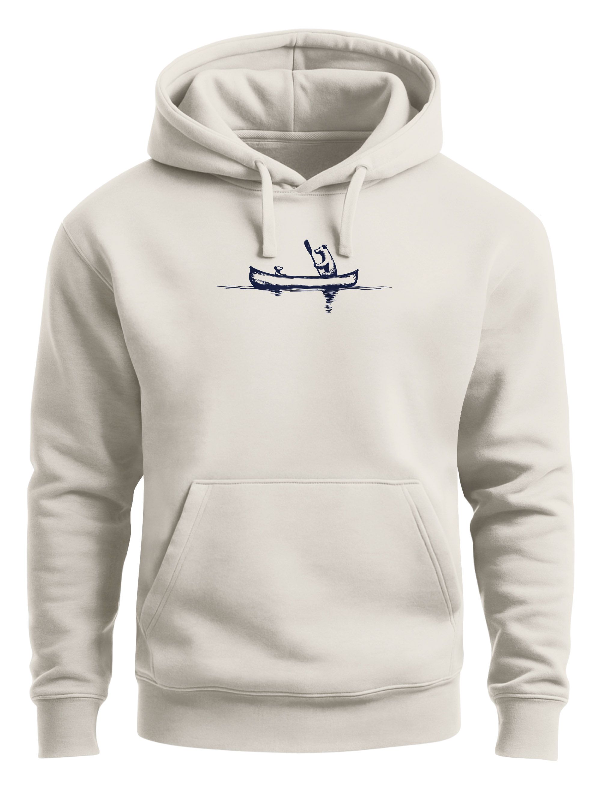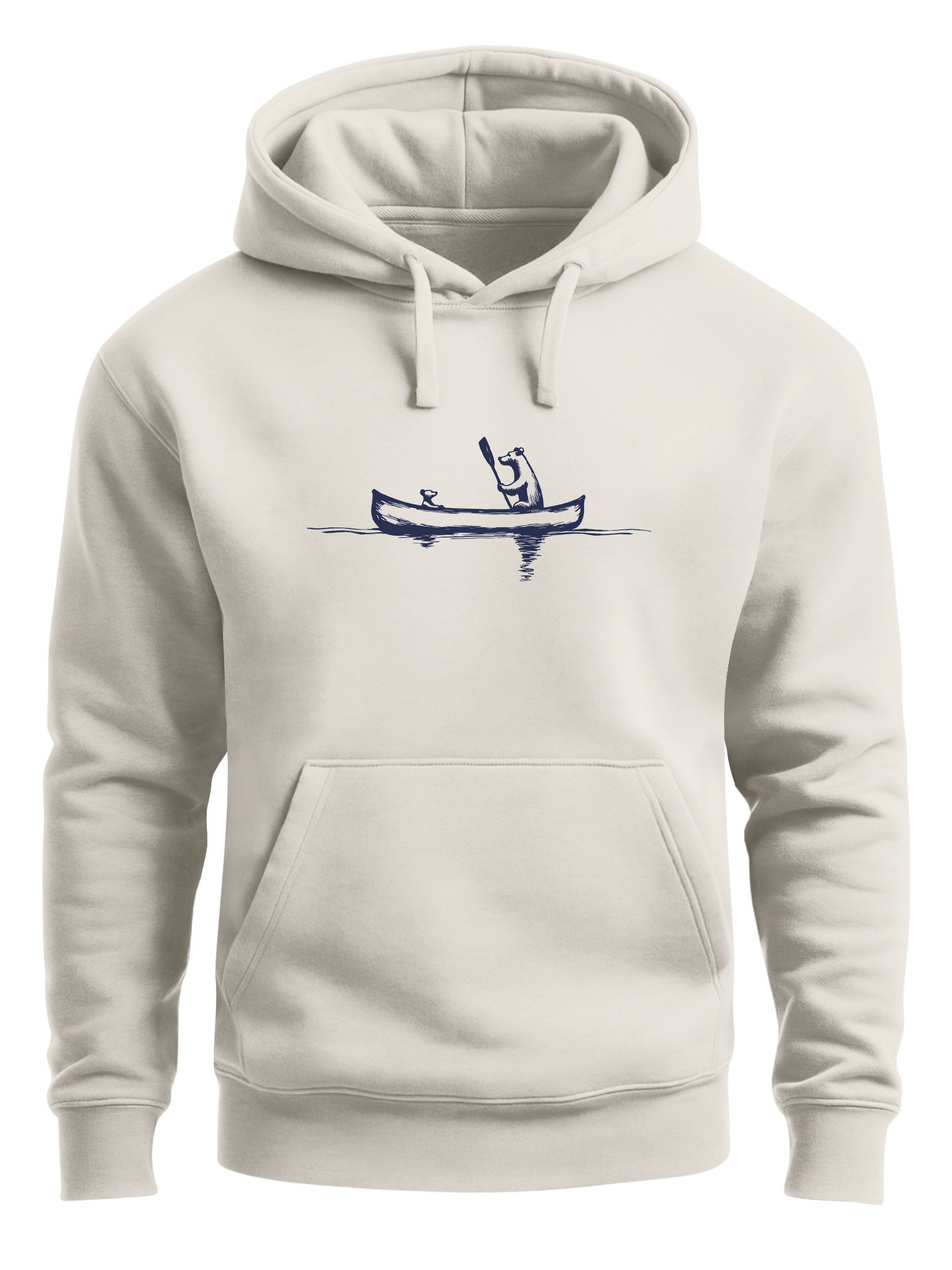 - Outdoor meets Minimalismus – Der lässige Look dieses Kapuzenpullovers mit minimalistischem Frontprint verleiht deinem Outfit einen authentischen, retro-inspirierten Stil. Das harmonische Natur-Motiv mit Bär und Kanu ist perfekt für Natur-Liebhaber, die Outdoor-Aktivitäten lieben.
