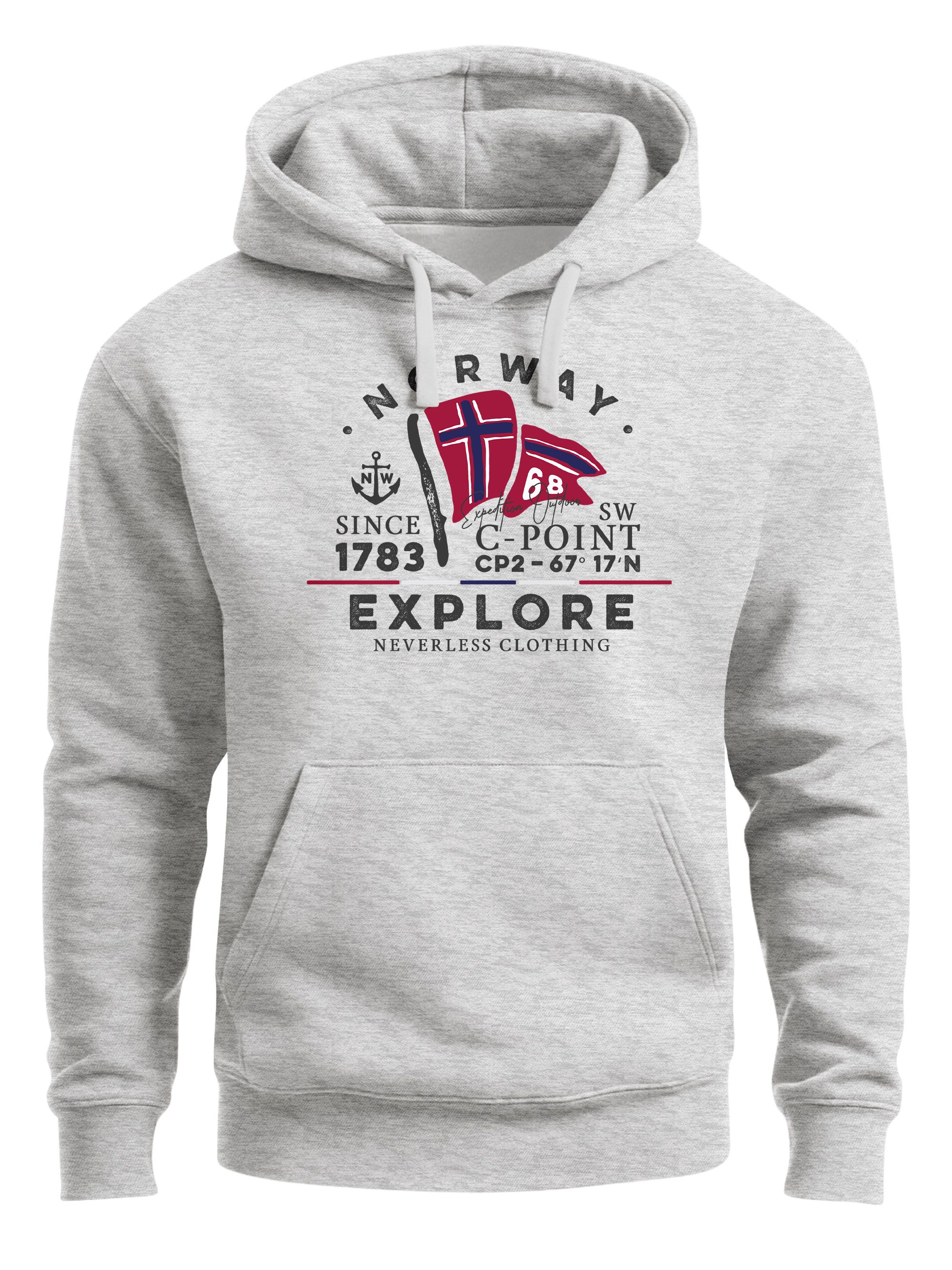 - Key-Piece für kühle Tage der Marke Neverless® Lässiger Hoodie für Herren mit Schriftzug "Norway Explore" und norwegischem Flaggensymbol und Koordinaten. Ein trendiger Kapuzenpullover für alle Nordlichter und Norwegen-Fans