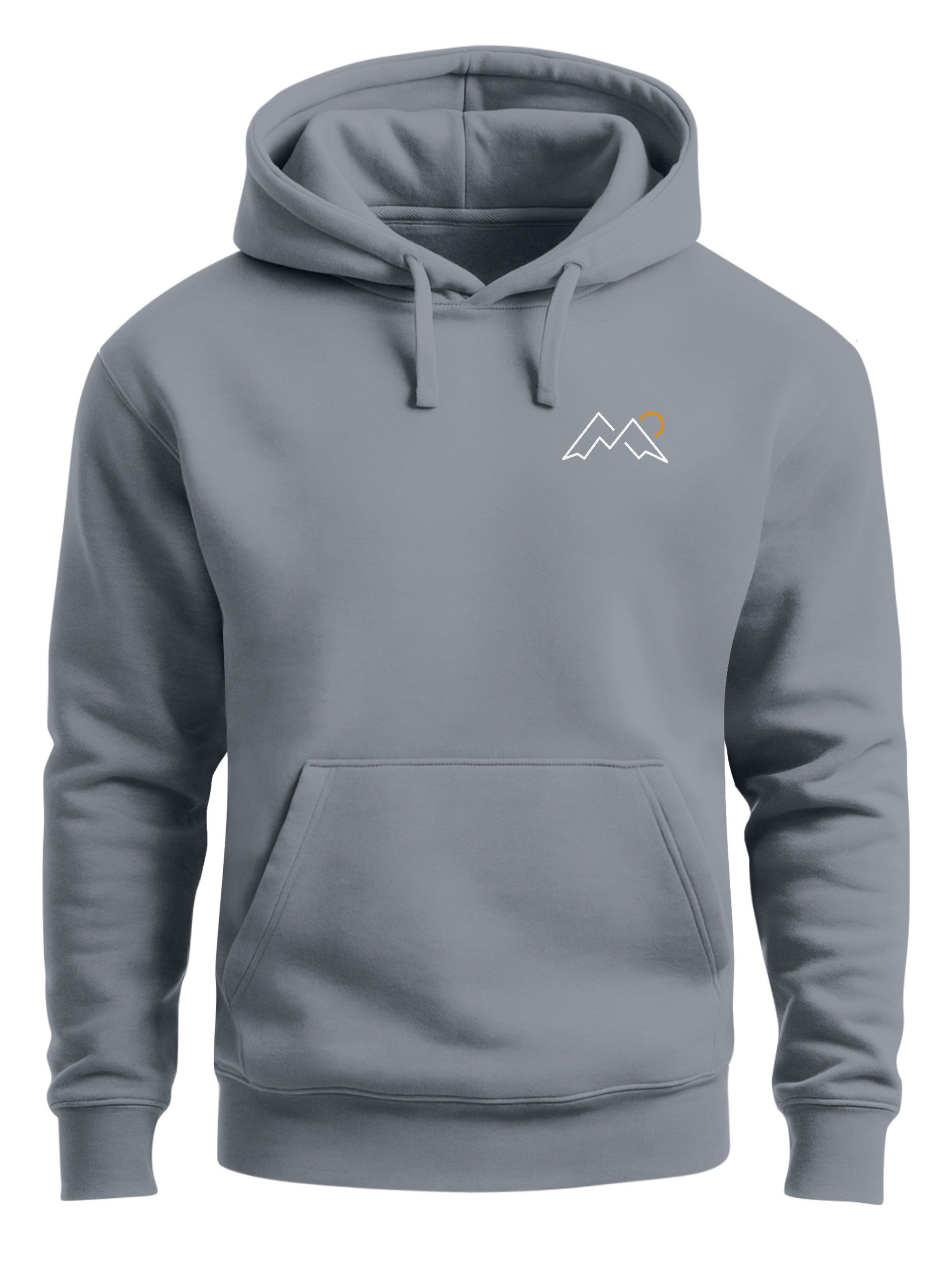 - Schlichter Herren Kapuzenpullover mit Bergsymbol und Sonnenprint. Ein dezentes Design für Naturfreunde, Reisende und urbane Outdoor Looks