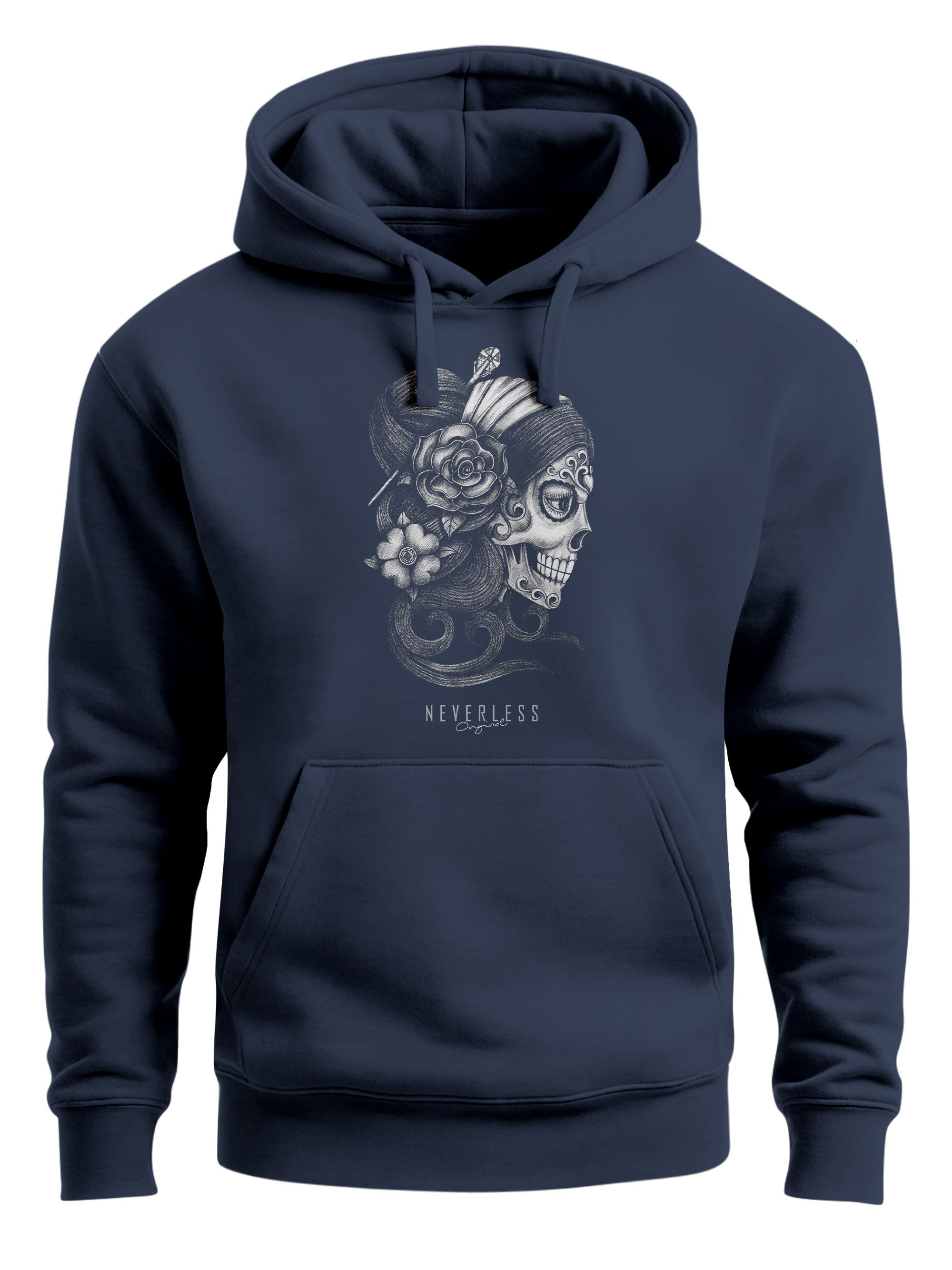 - Key-Piece für kühle Tage der Marke Neverless® Cooler Hoodie für Herren mit La Catrina Skull Print im Tattoo Style. Ein lässiger Kapuzenpulli für alle Männer, die ein Oberteil für ein individuelles, stylishes Streetwear Outfit suchen