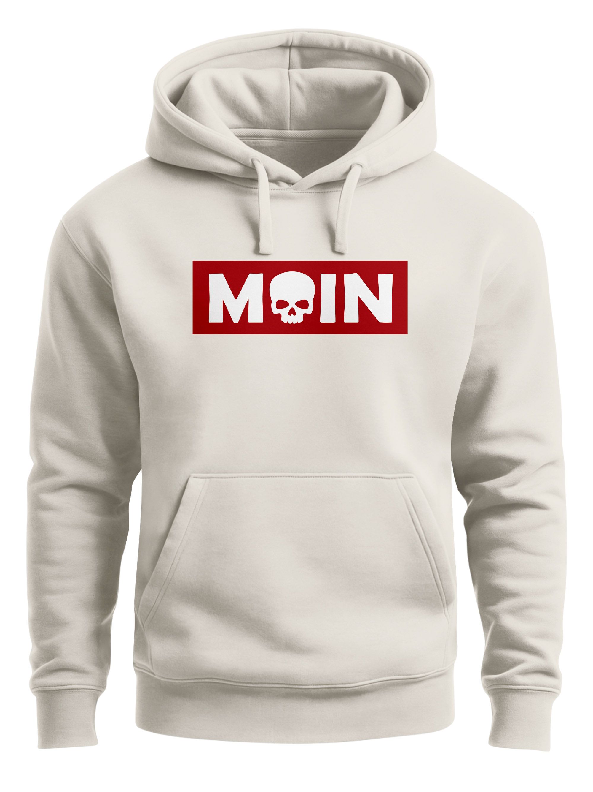 - Cooler Kapuzenpullover für Männer mit rotem Balken und Aufschrift "Moin". Kombiniert mit Totenkopf ist das individuelle Design ein echter Hingucker und ein Must Have für alle Nordlichter