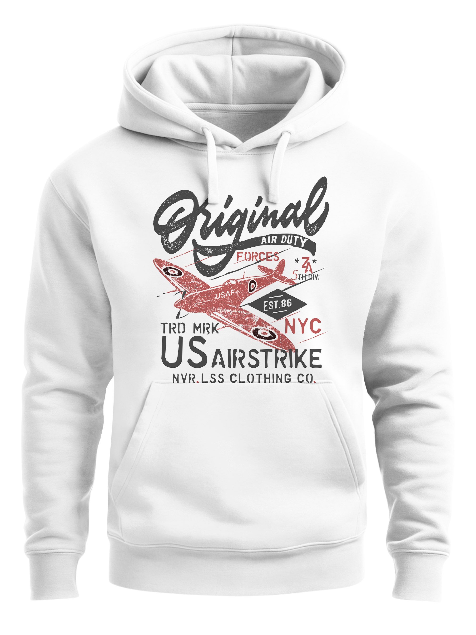 - Key-Piece für kühle Tage der Marke Neverless® Lässiger Hoodie für Herren Aufdruck mit einer Spitfire und dem Retro Schriftzug "Original US Airstrike". Das geniale Motiv ist ein echter Eyecatcher und ein Must have für alle Luftfahrt- und Army Fans und Fans von Retro Print-Shirts