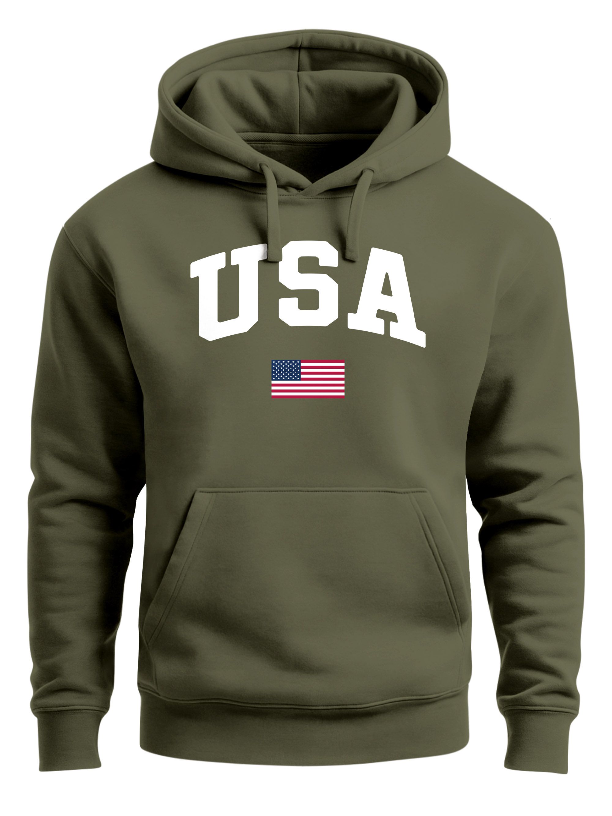 - Klassischer Kapuzenpulli für Männer mit großem USA-Schriftzug im College-Style und US-Flagge in lebendigen Farben. Er lässt sich vielseitig mit Jeans, Shorts oder Jogginghosen kombinieren. Passt gut zu jedem lässigen Casual Look