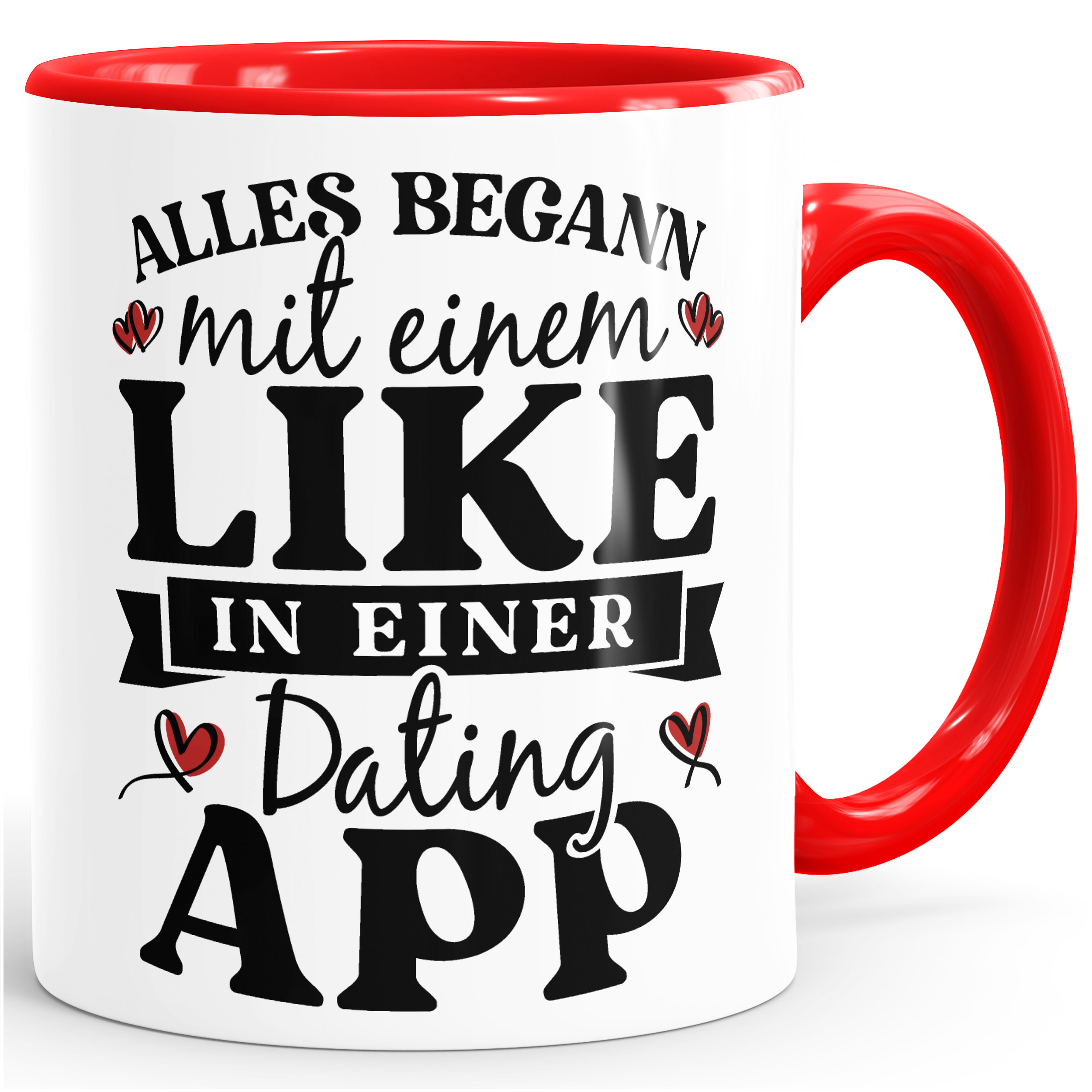 • Motiv (rundum bedruckt): Liebes-Spruch "Alles begann mit einem Like in einer Dating App"
