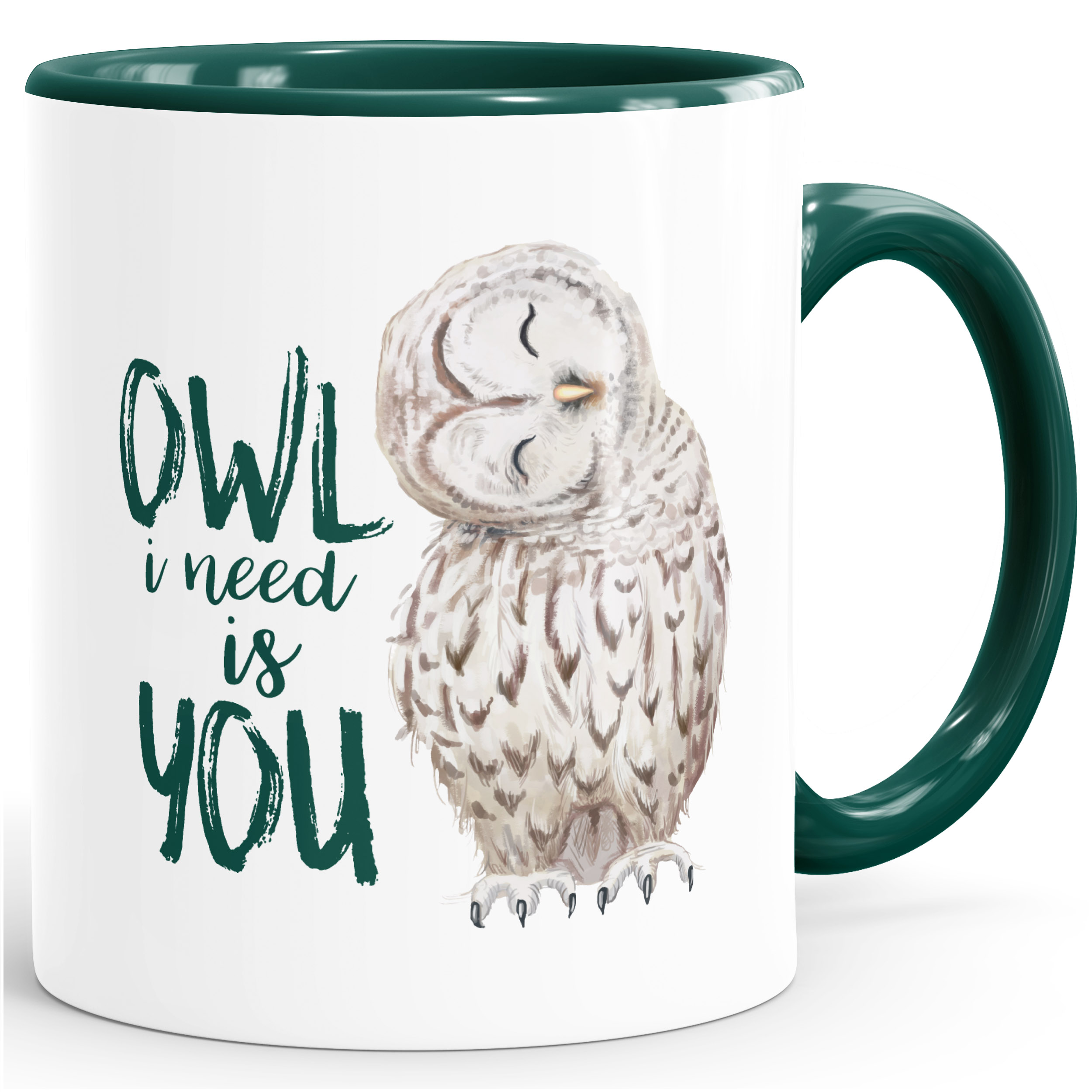 - kreative, witzige und absolut zauberhafte Geschenk-Tasse für Verliebte: Kaffeetasse mit süßer Eule im Watercolor Stil und lustigem Wortspiel "Owl i need is you" sowie farbigem Henkel und Innenfarbe der Marke MoonWorks®