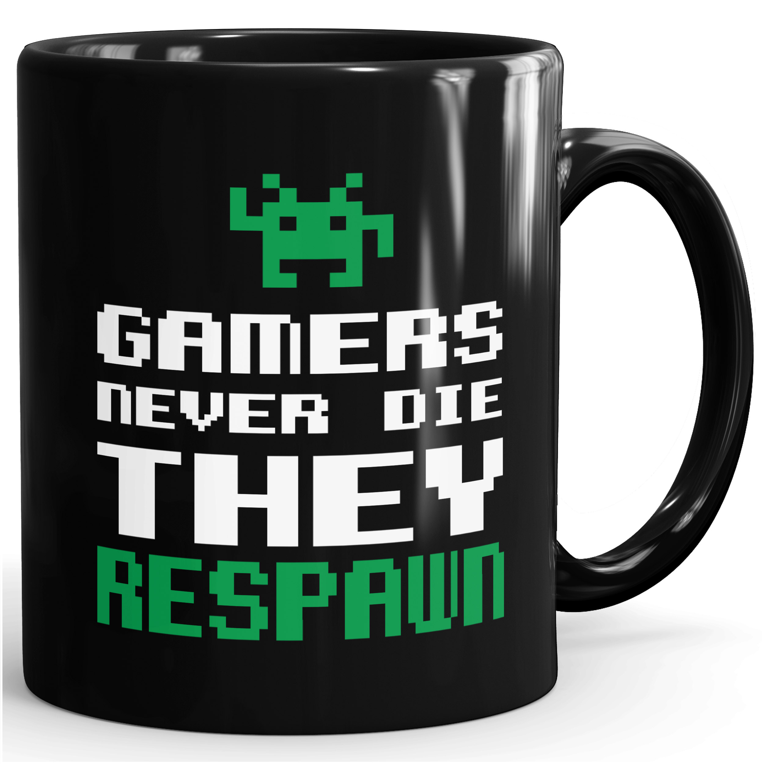 - Motiv (beidseitig bedruckt): Pixelgrafik, Pixelmonster, Spruch, Gamers never die they respawn, spawn, Pixelschrift