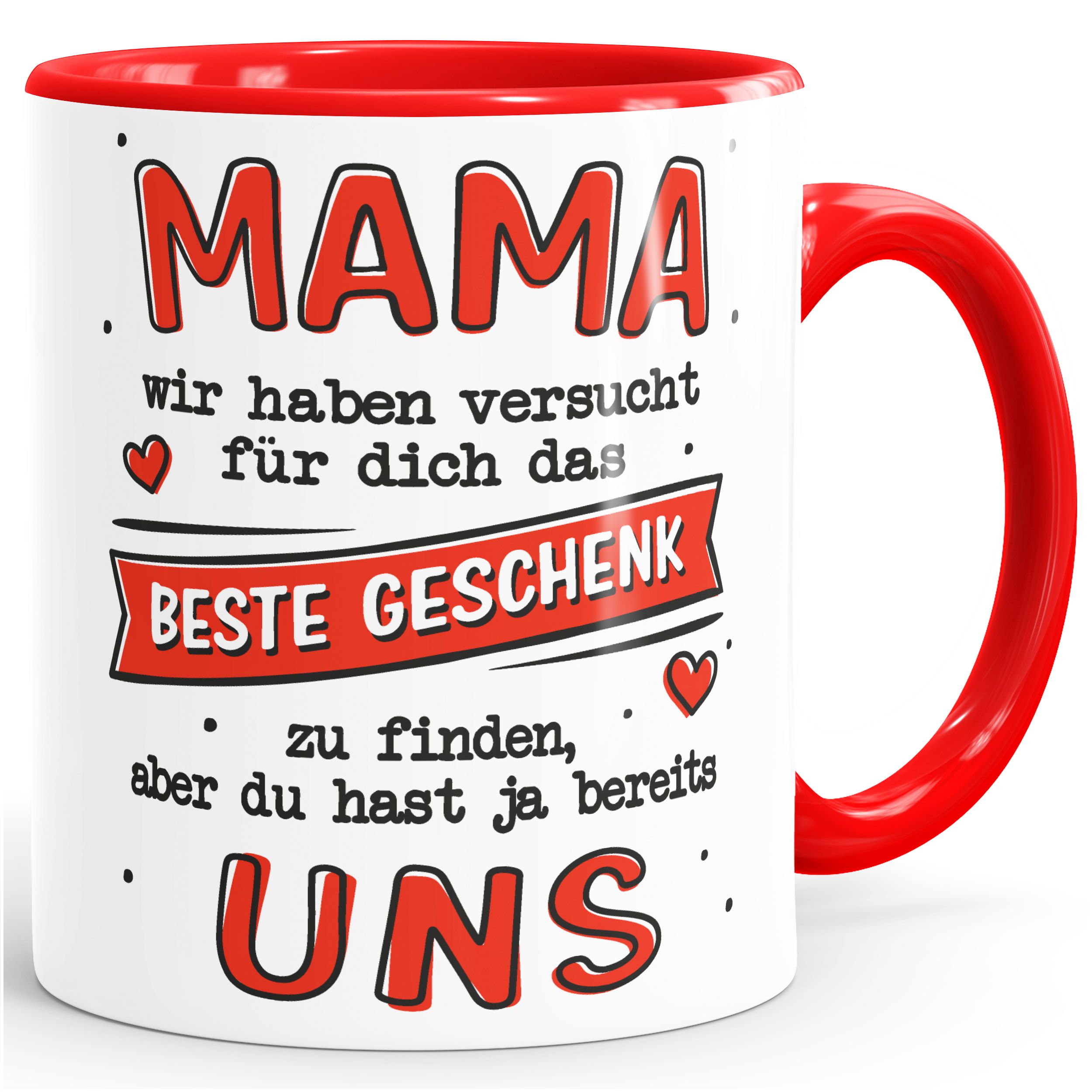 • Obligatorische Blumensträuße und kalorienbombige Pralinen kann jeder. Bringt eure Mama doch lieber zum Lachen! Mit einem lustigen Geschenk zum Muttertag, wie diese Tasse mit witzigem Spruch: Wir haben versucht das beste Geschenk für dich zu finden, aber du hast ja bereits uns!