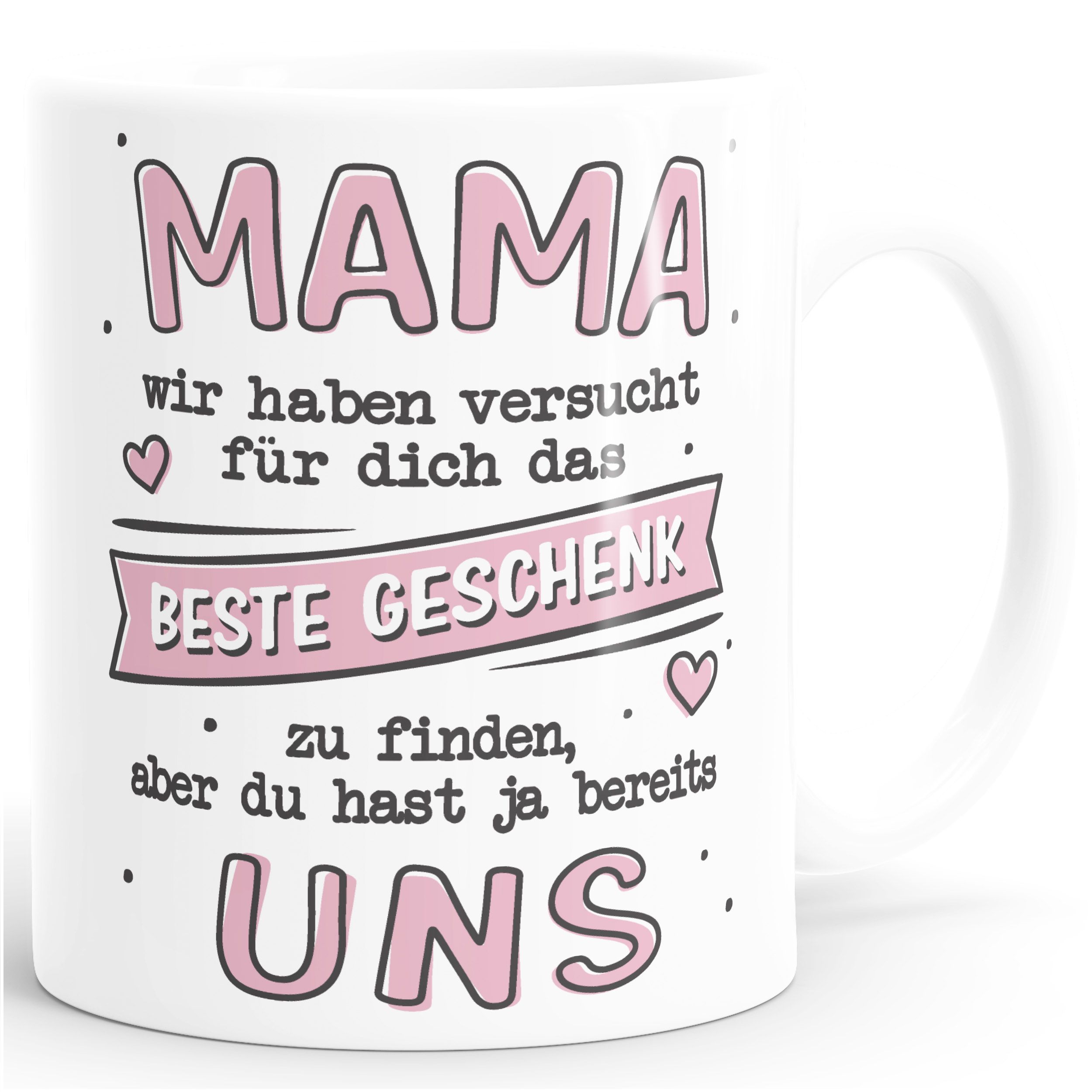 • Obligatorische Blumensträuße und kalorienbombige Pralinen kann jeder. Bringt eure Mama doch lieber zum Lachen! Mit einem lustigen Geschenk zum Muttertag, wie diese Tasse mit witzigem Spruch: Wir haben versucht das beste Geschenk für dich zu finden, aber du hast ja bereits uns!