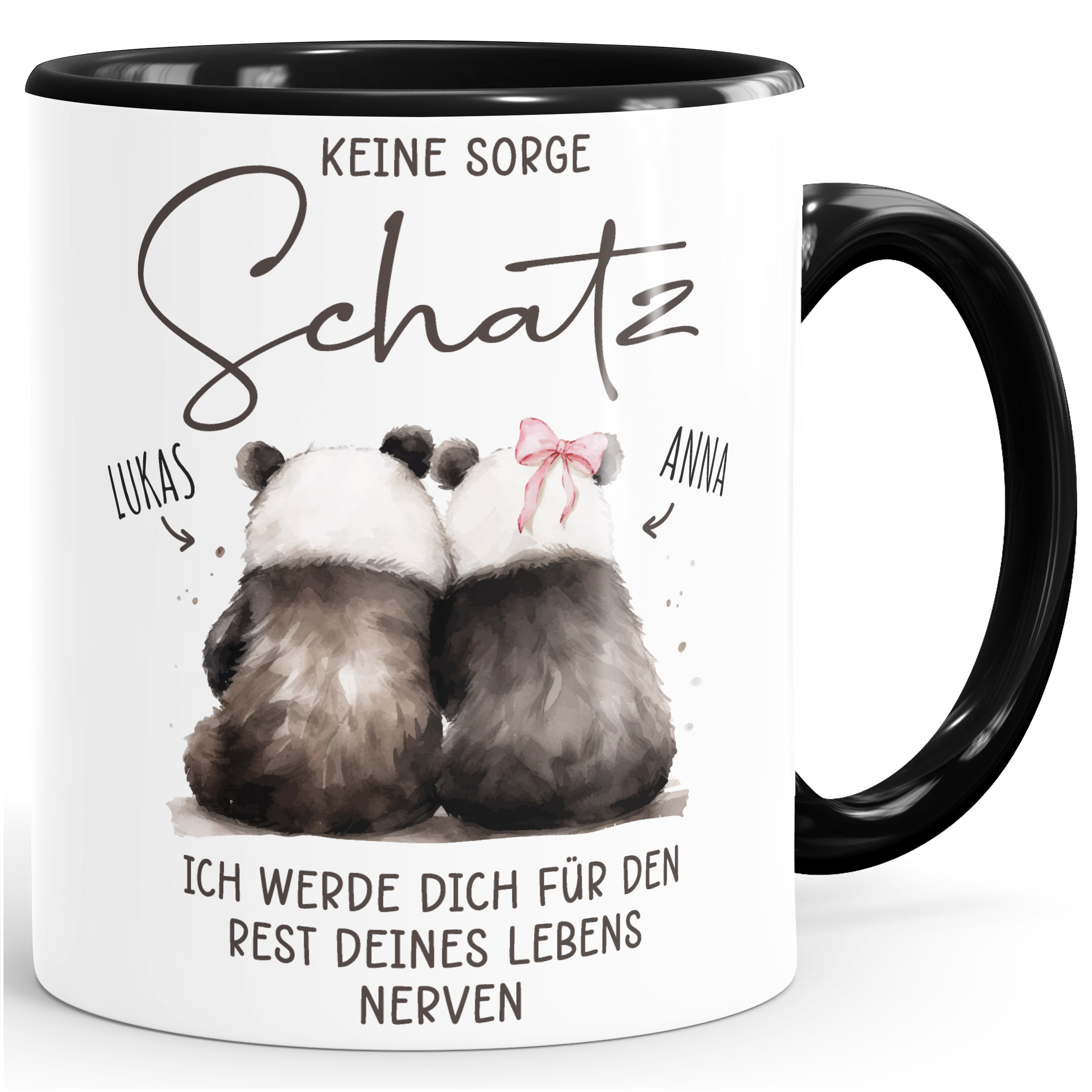 - Motiv (rundum bedruckt): Panda Bären Paar, "Keine Sorge Schatz, ich werde dich für den Rest deines Lebens nerven", Wunsch-Namen