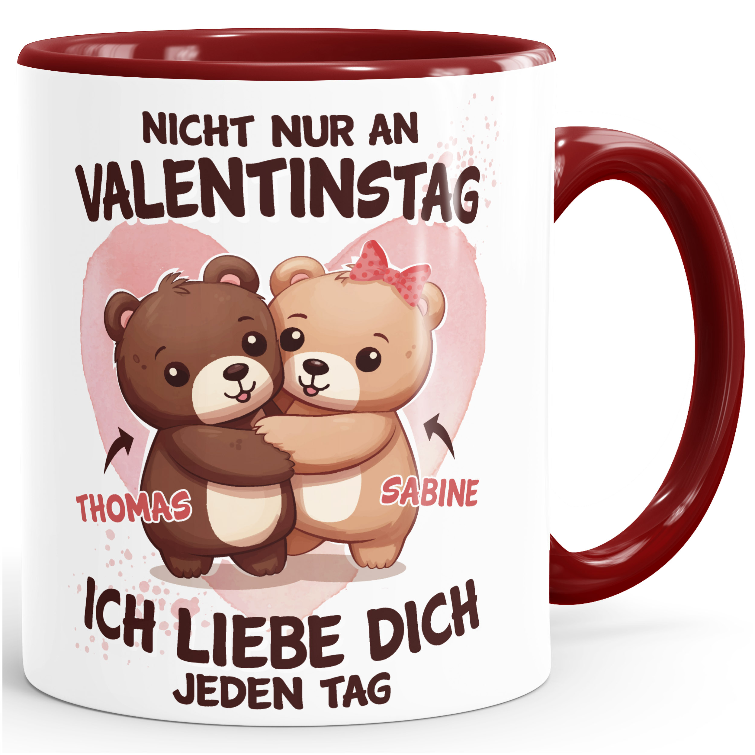 - Ein süßes Geschenk zum Valentinstag für ihn oder sie. Eine Geschenk-Tasse ist vielleicht "nur" eine Kleinigkeit, aber personalisiert mit euren eigenen Namen, dem niedlichen Bären-Pärchen und dem Spruch "Ich liebe dich jeden Tag" ist sie eine großartige Liebeserklärung