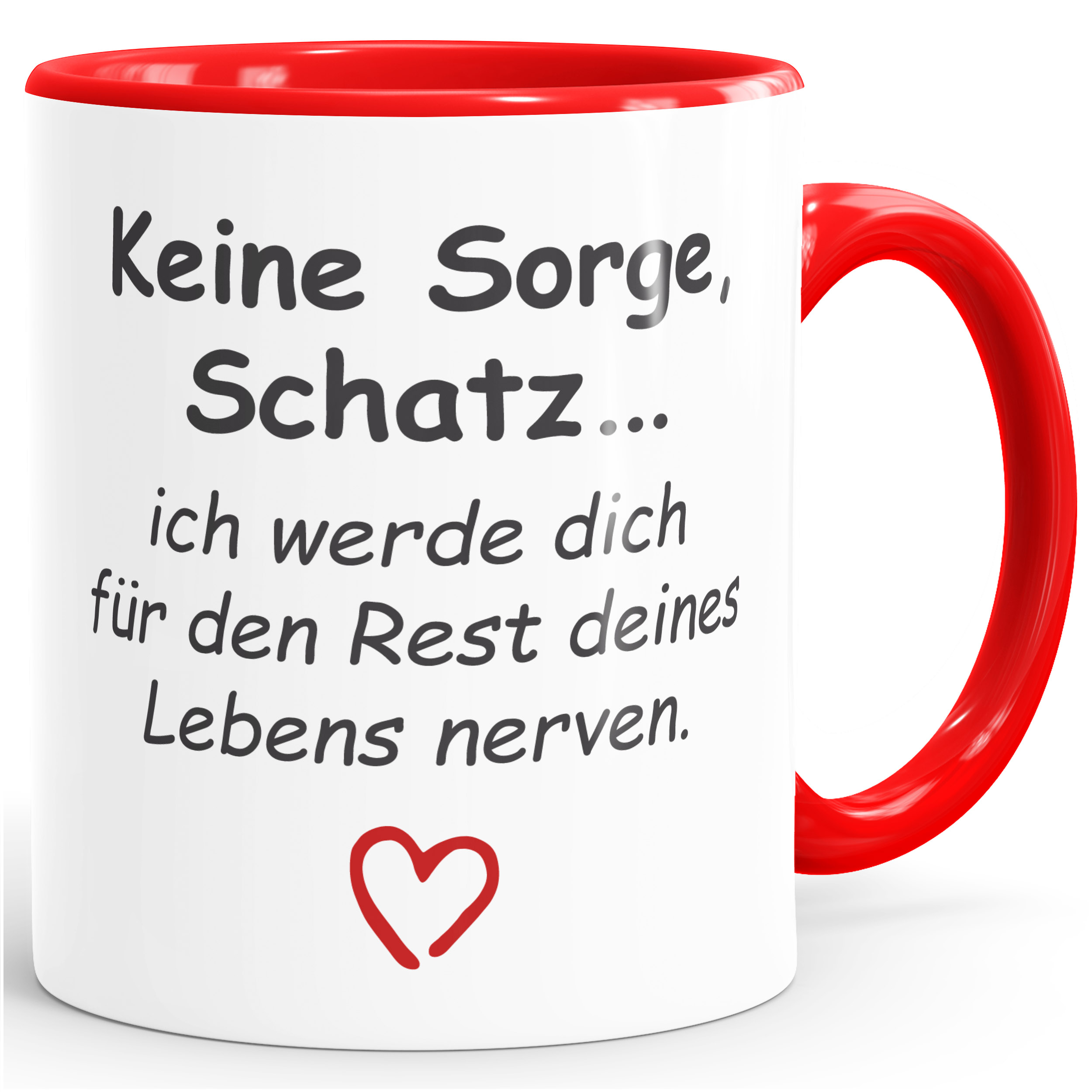 - Eine Liebeserklärung mit ironischem Augenzwinkern : "Keine Sorge Schatz, ich werde dich für den Rest deines Lebens nerven" ...wenn das mal keine Drohung ist ;-) Auf jeden Fall ist diese Tasse mit Herzgriiff eine originelle Geschenkidee für den Liebsten oder die Liebste