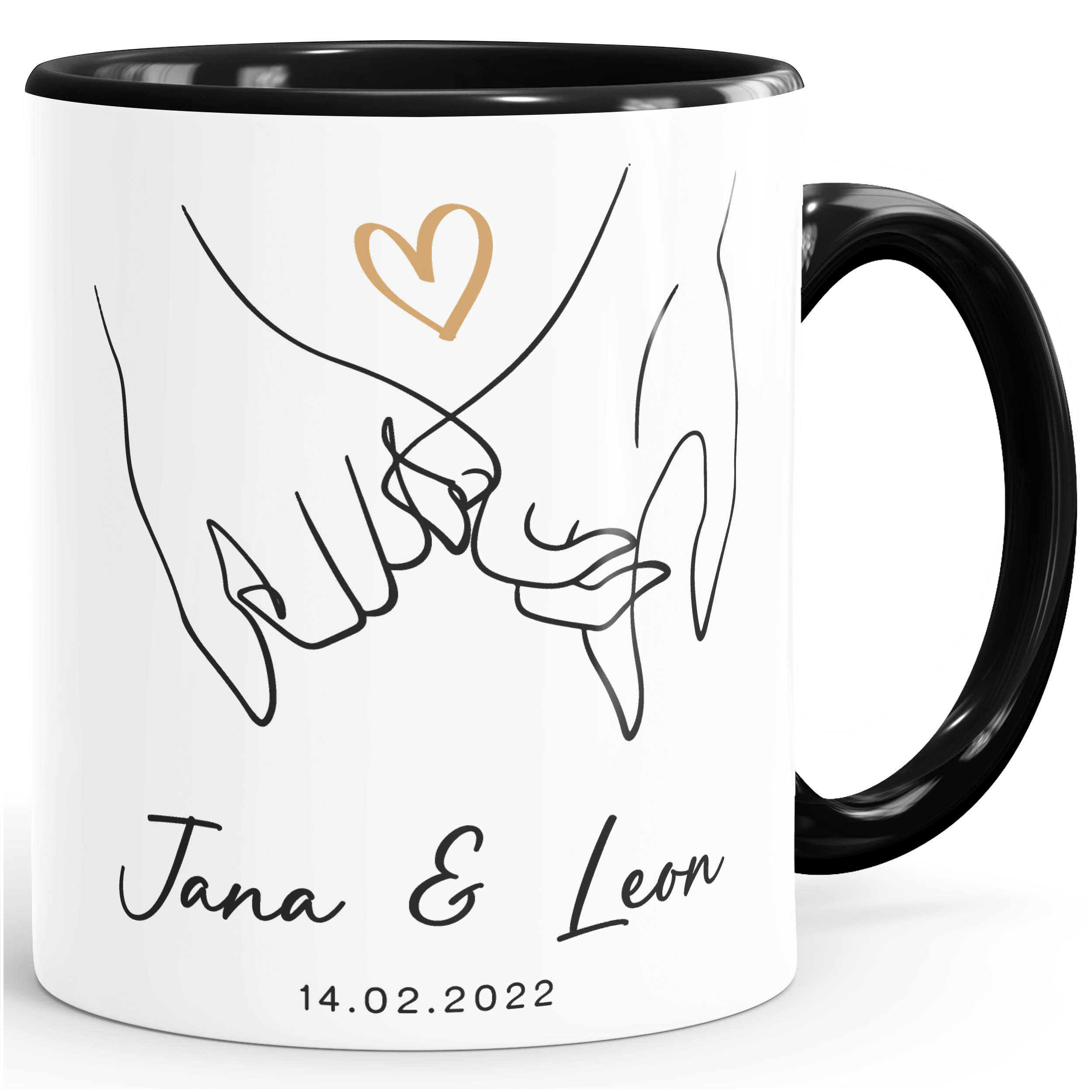 - Mit dieser wunderschönen Tasse zelebriert ihr mit jedem Schluck euer Liebesglück! Eine tolle Geschenkidee für frisch ...uind Langzeit Verliebte - zum Jahrestag, Hochzeitstag oder Valentinstag. Das Hände-Motiv im Line-Art Stil ist personalisierbar mit Wunschnamen und Datum