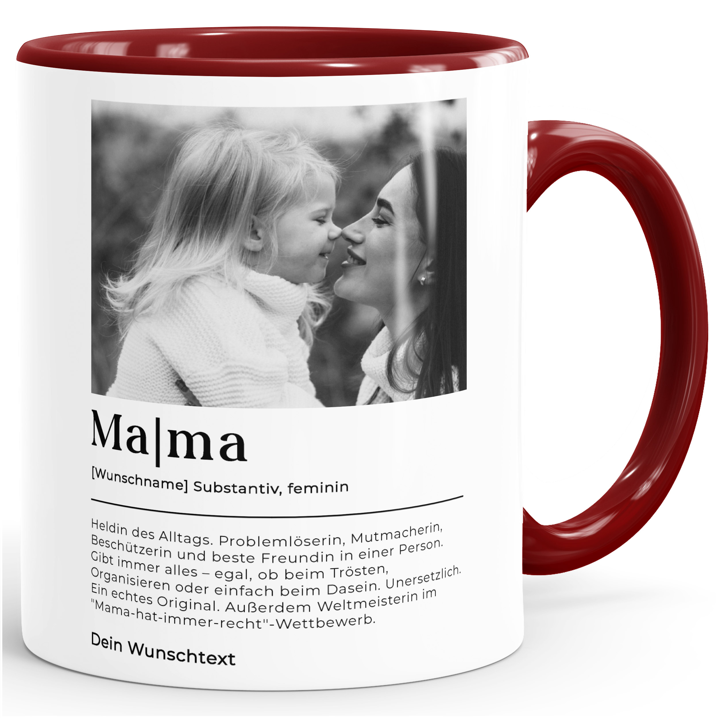 - Dieses kreative Design im Wörterbuchstil bringt auf den Punkt, was Mama wirklich ist: Heldin, Zuhörerin, Mutmacherin, beste Freundin und mehr. Mit eigenem Bild und Text wird aus dieser wunderschönen Tasse ein persönliches Dankeschön Geschenk mit Tiefgang
