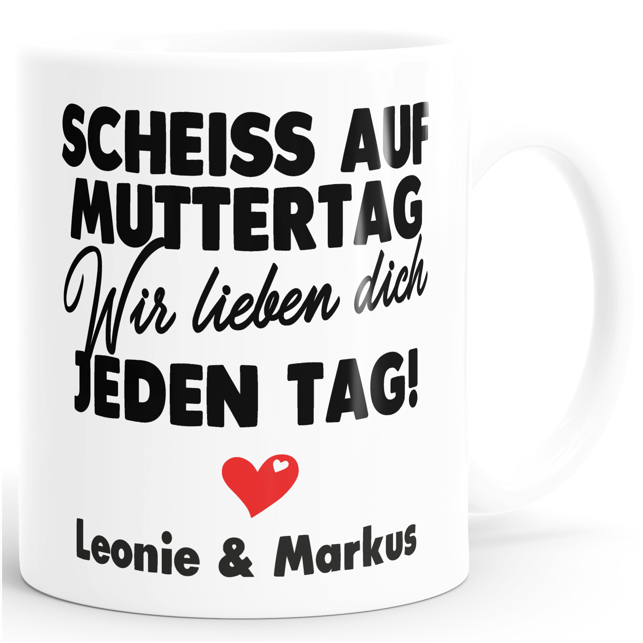 - personalisierbares Motiv: lustiger Spruch "Scheiss auf Muttertag wir lieben dich jeden Tag", Herz-Motiv, Namen anpassbar