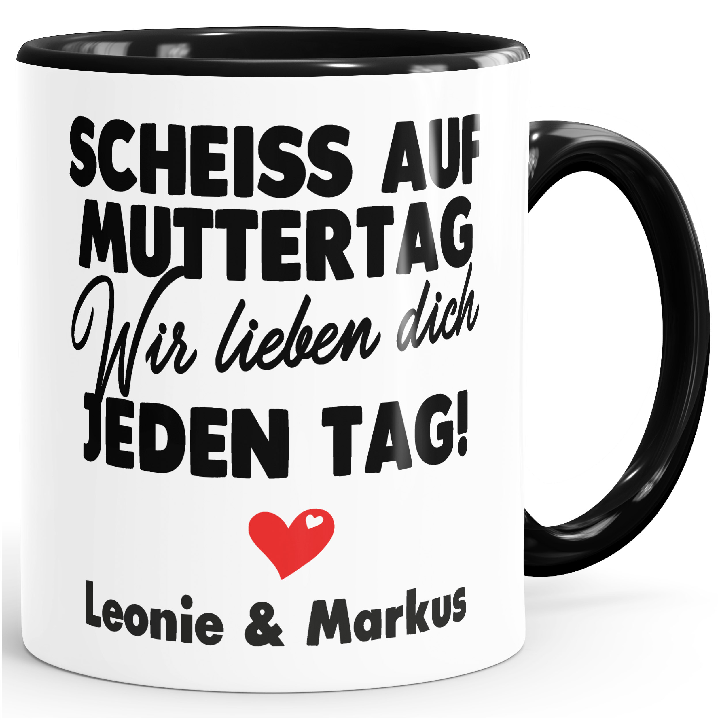 - personalisierbares Motiv: lustiger Spruch "Scheiss auf Muttertag wir lieben dich jeden Tag", Herz-Motiv, Namen anpassbar