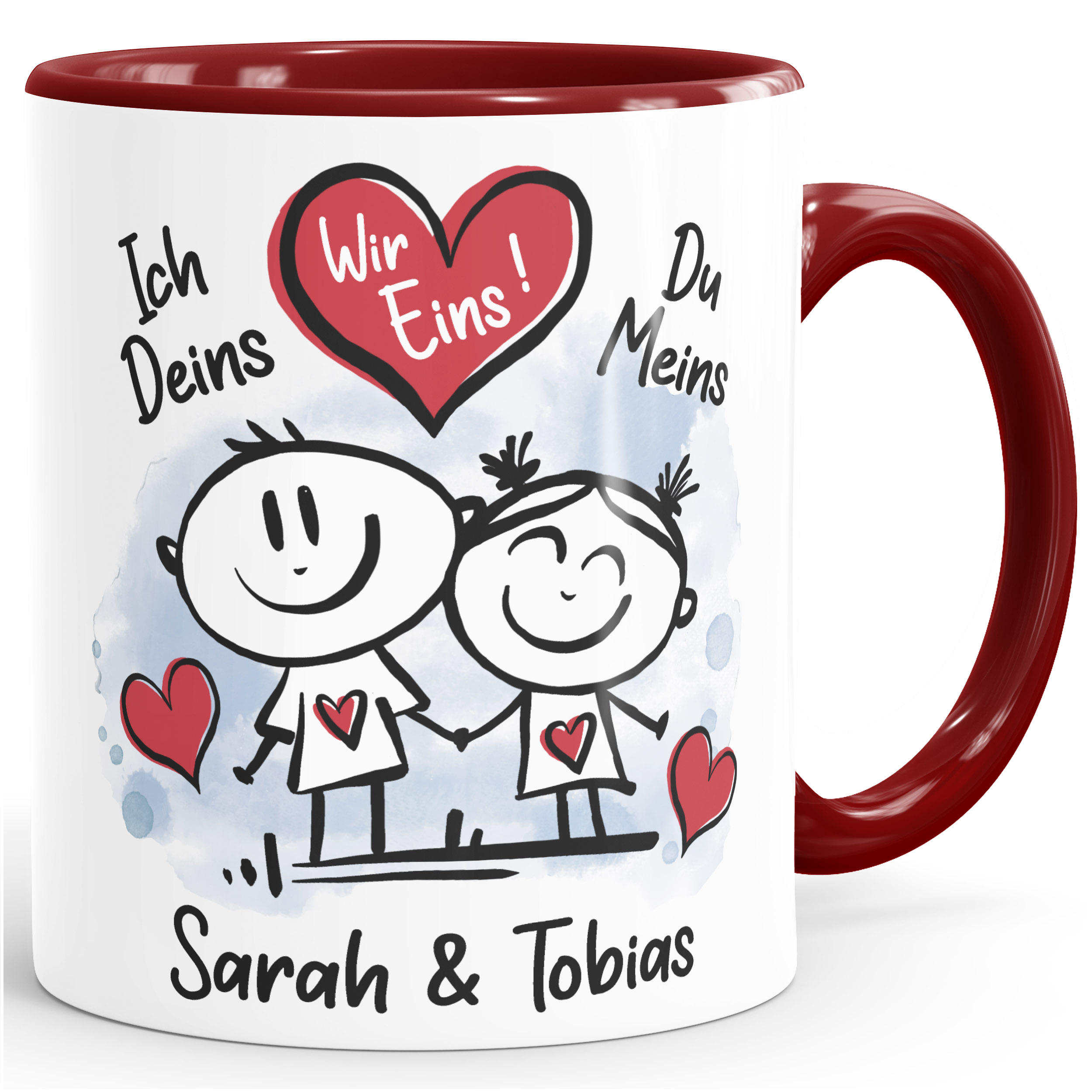 - Überrasche deinen Schatz mit einem liebvollen Geschenk, denn kleine Liebeserklärungen erhalten und beleben die Beziehung! Und wenn sie so herzerweichend süß ist wie unser verliebtes Strichmännchen-Paar mit den eigenen Namen und Spruch "Ich Deins, Du Meins, Wir Eins" steht einer langen zweisamen Zeit nix mehr im Weg! ;-)