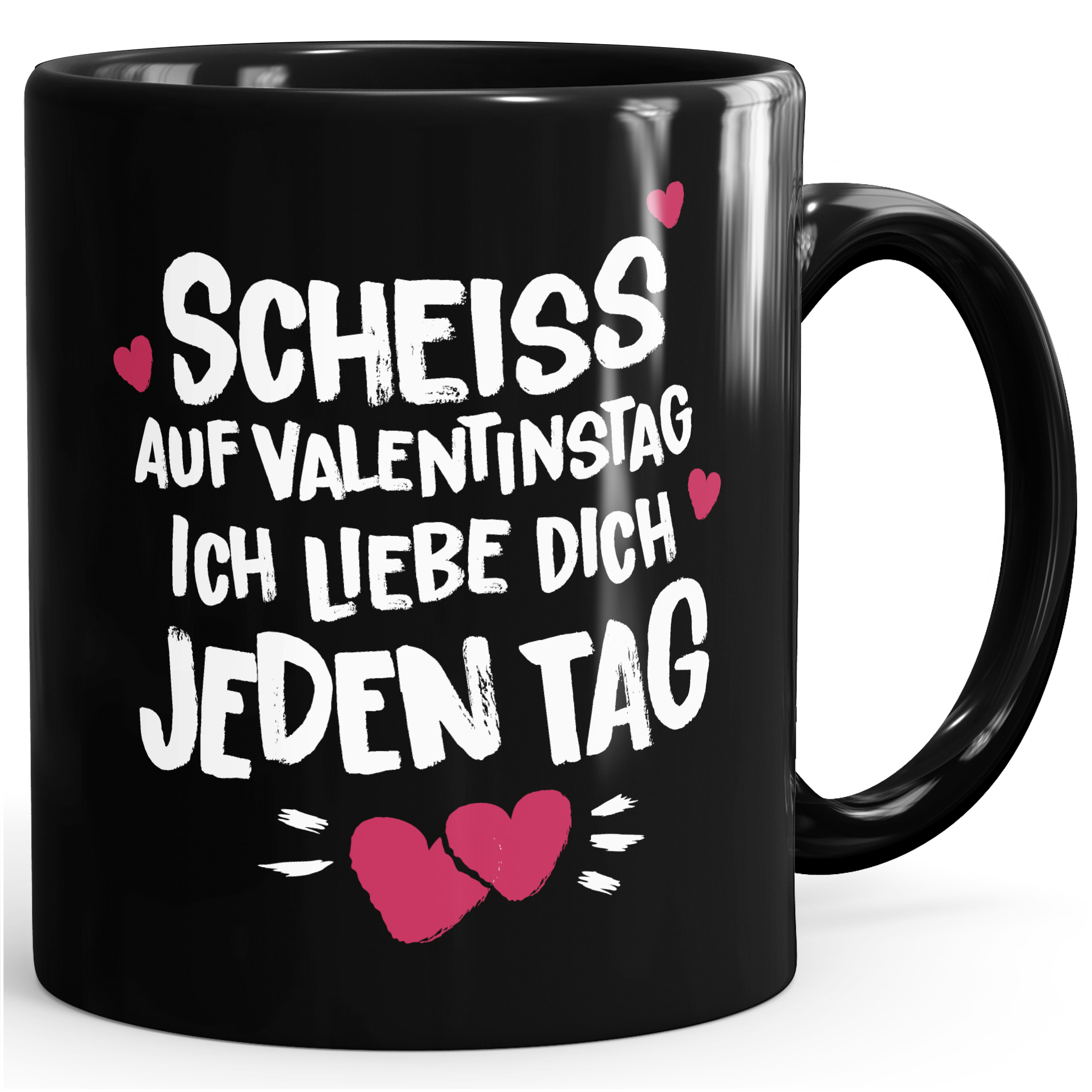 - Motiv (rundum bedruckt): lustiger Spruch "Scheiss auf Valentinstag, ich liebe dich jeden Tag", Herz