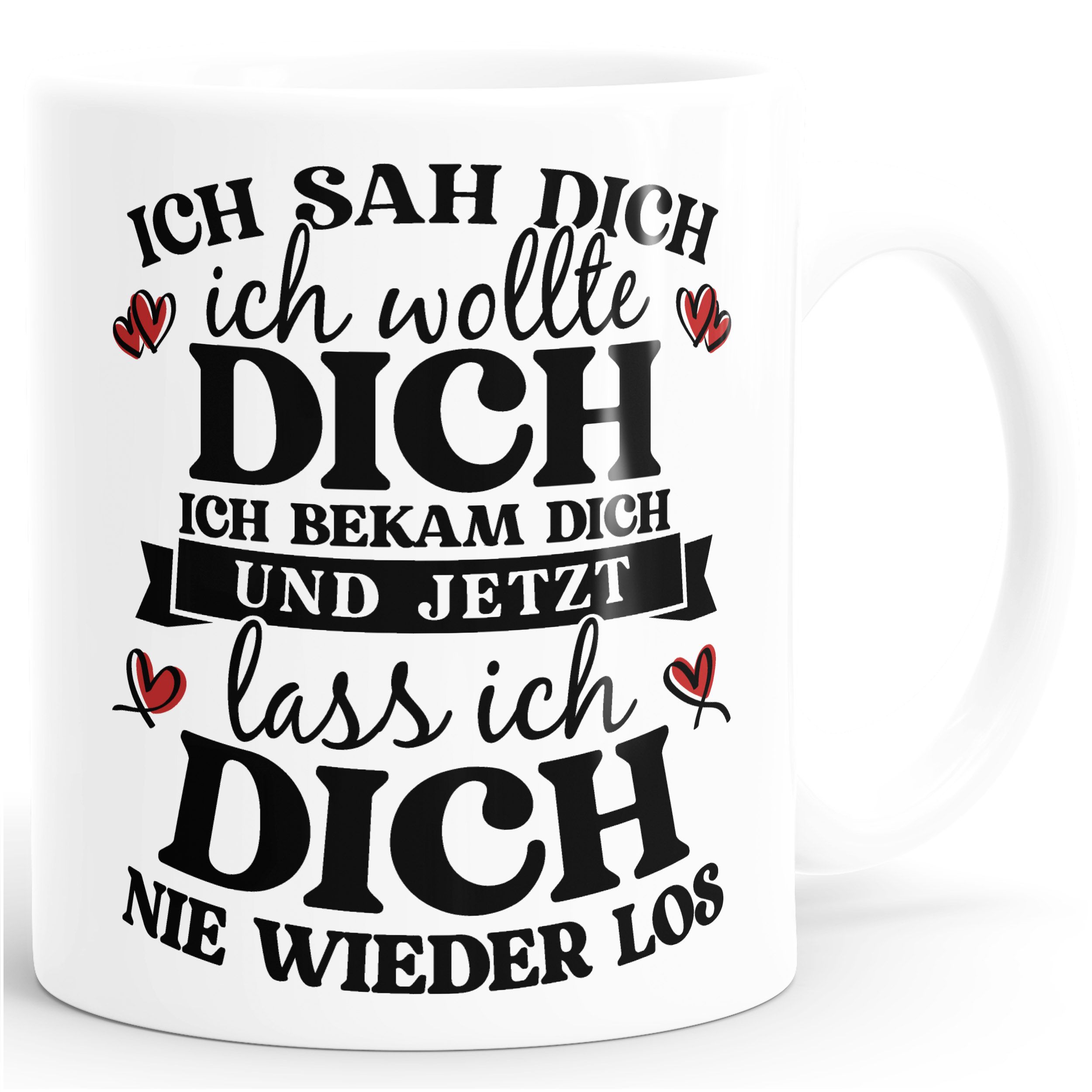 - Bedruckt mit dem liebevollen Spruch "Ich sah dich, ich wollte dich, ich bekam dich und jetzt lass ich dich nie wieder los" ist diese zauberhafte Tasse eine schöne Liebeserklärung und gleichzeitig perfekte Geschenkidee zum Jahres- oder Valentinstag