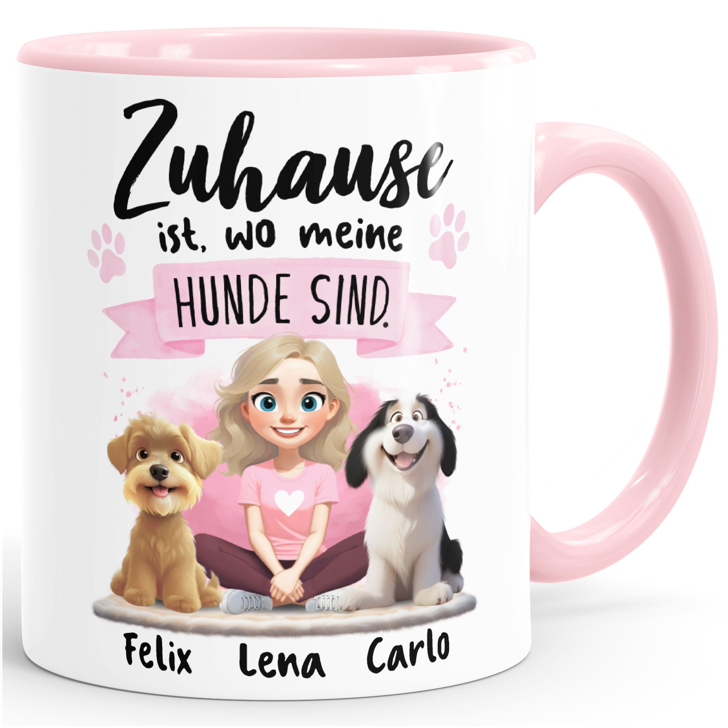 Diese Tasse ist das perfekte Geschenk für alle Hundeliebhaberinnen, die ihr Rudel im Herzen tragen. Mit Namen, Wunsch-Hunderassen und liebevoll gestalteten Figuren entsteht ein echtes Unikat. Ob zum Geburtstag, Muttertag, Weihnachtsgeschenk oder einfach als kleine Überraschung – diese Keramik-Tasse schenkt täglich Freude beim Kaffee oder Tee und zeigt: Zuhause ist, wo die Hunde sind. Coole Kaffeetassen, schöne Geschenktassen und lustige Bürotassen - persönliche Geschenkideen sind immer eine kreative Überraschung!